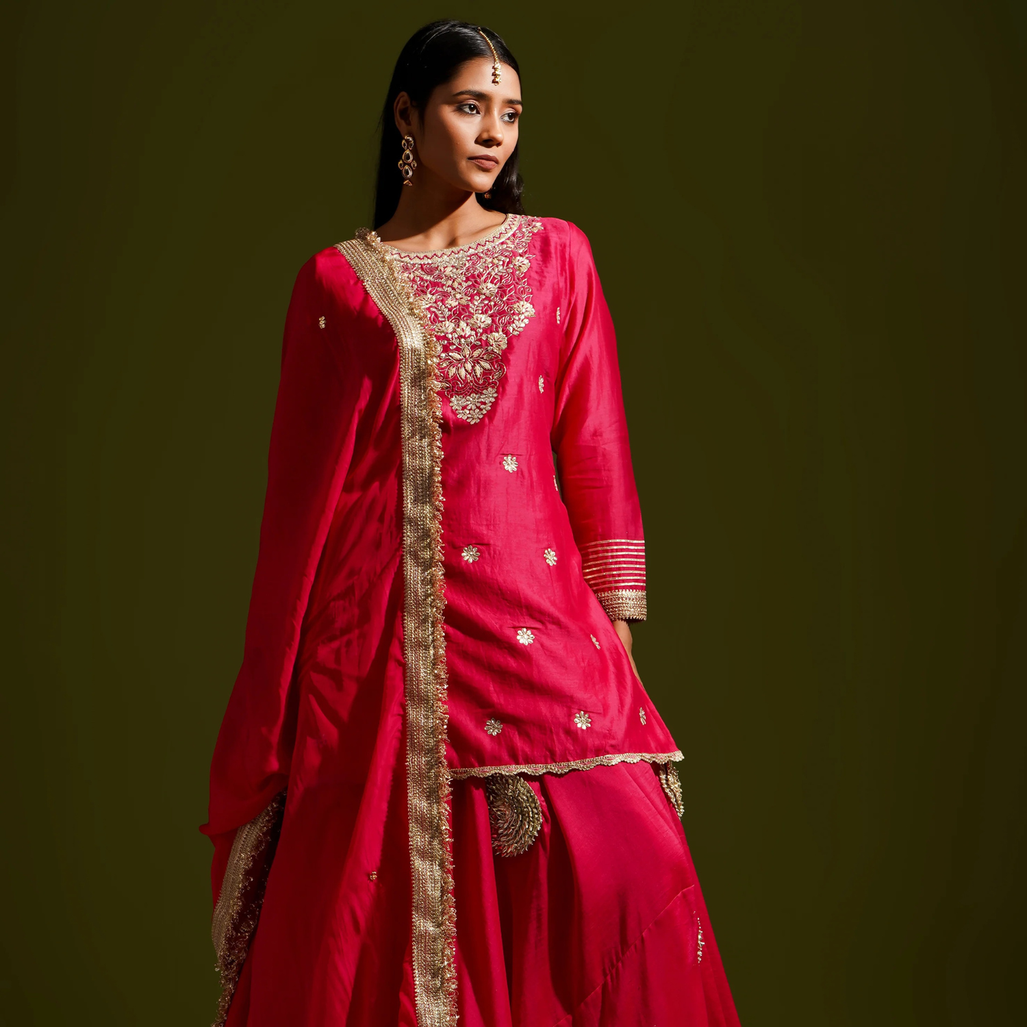 Within the elaborate stitches of the 3-D embroidery dupatta, the artistry of...