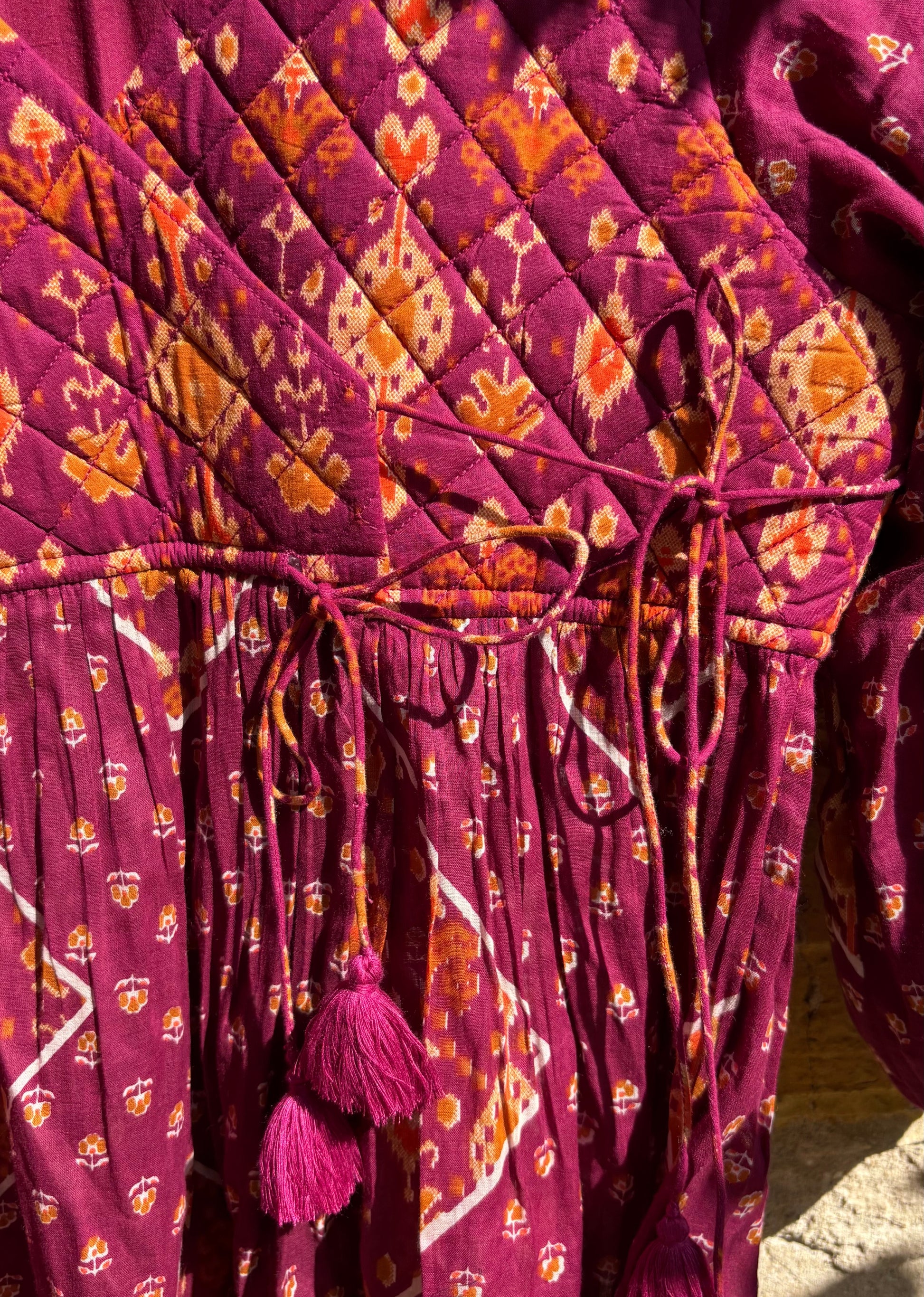 Angrakha pattern, gathers, fringes tassels, quilted |