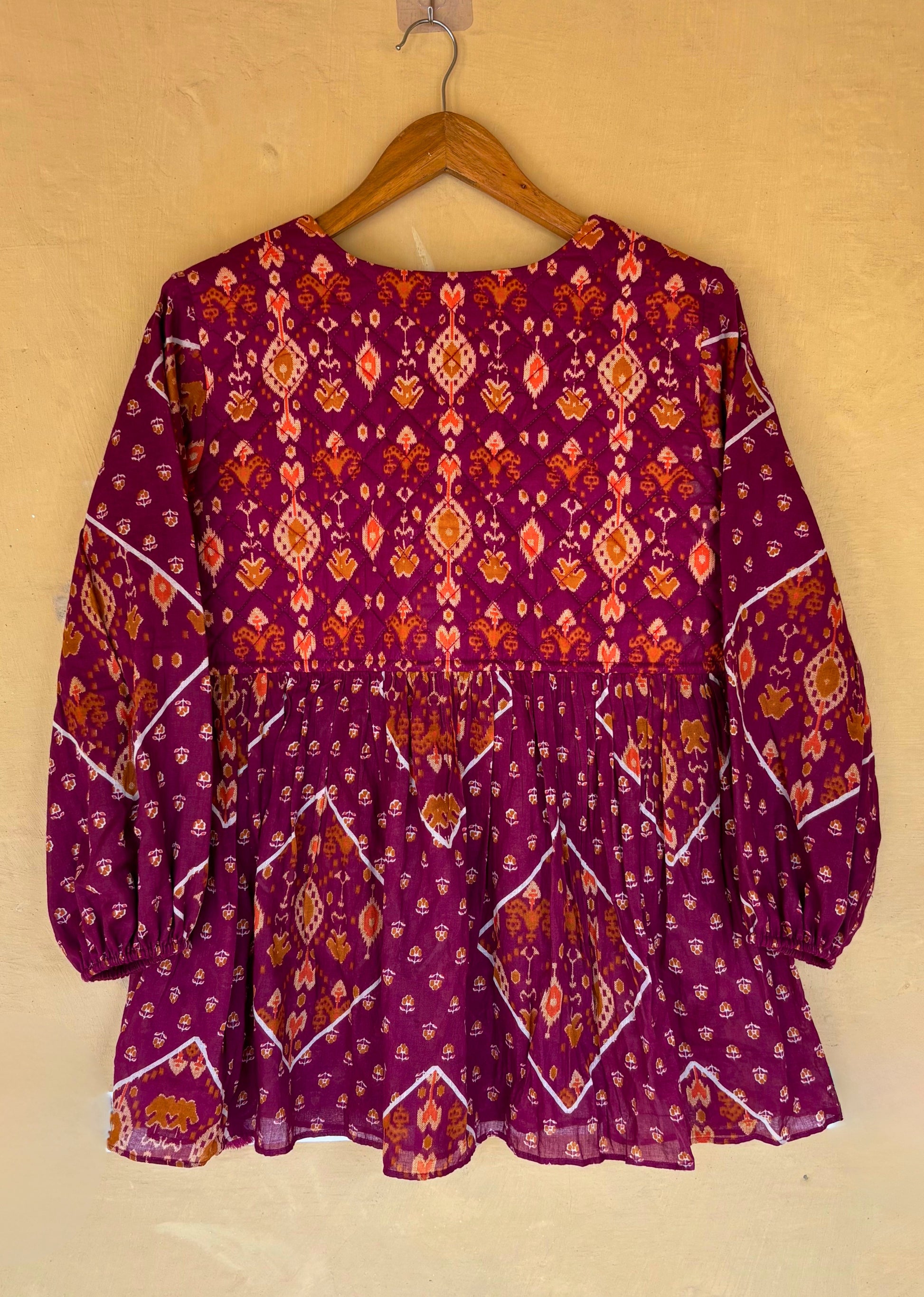 This waist-length quilted angrakha-style jacket features hand block-printing, full sleeves, elasticated cuffs, and tie-up closures with handmade fringes tassels. Designed with waist gathers for a flattering fit, it offers warmth, comfort, and a stylish touch—making it a perfect winter essential.