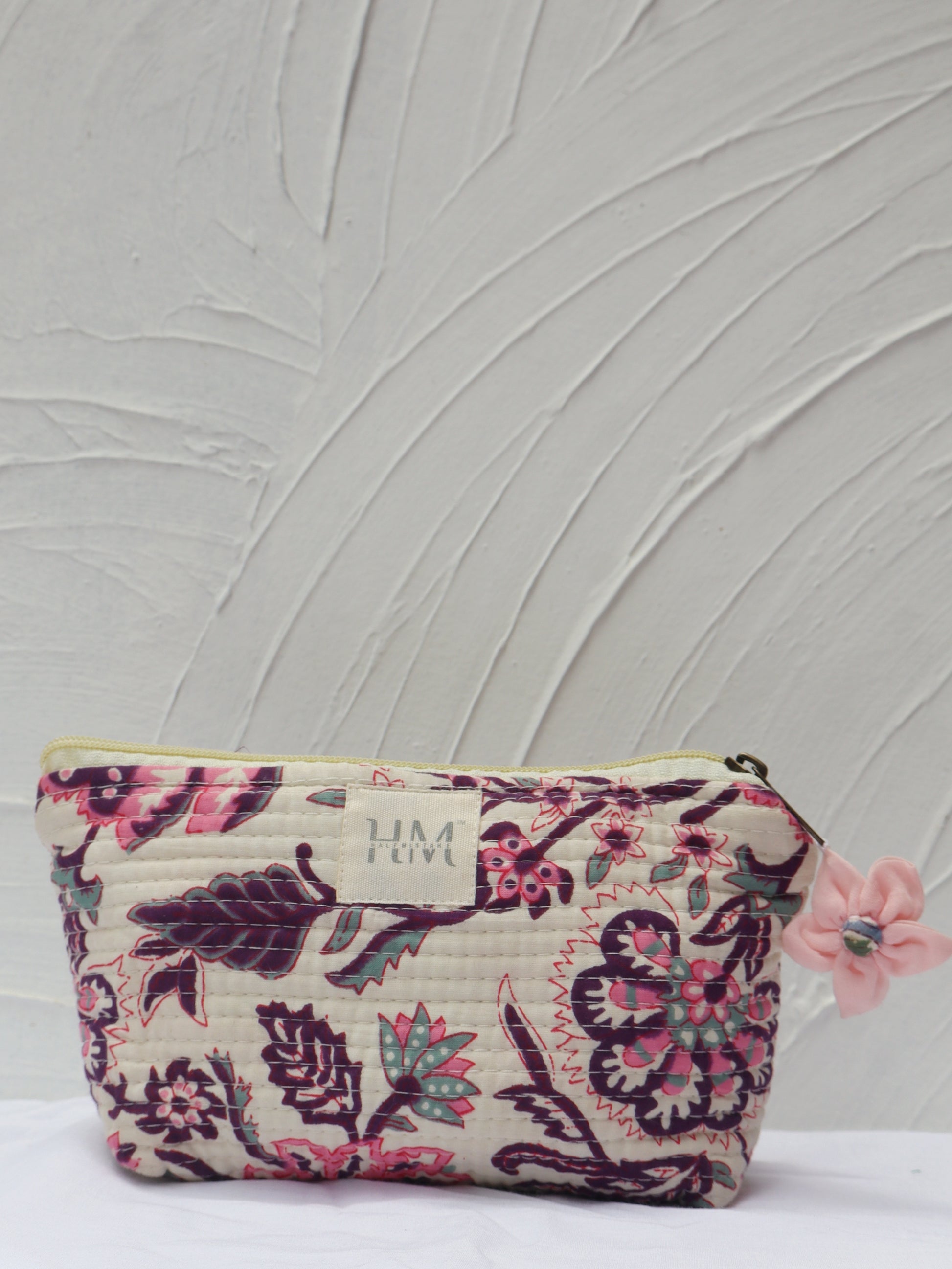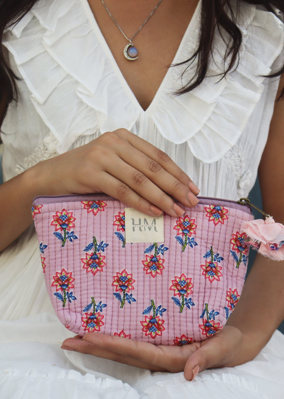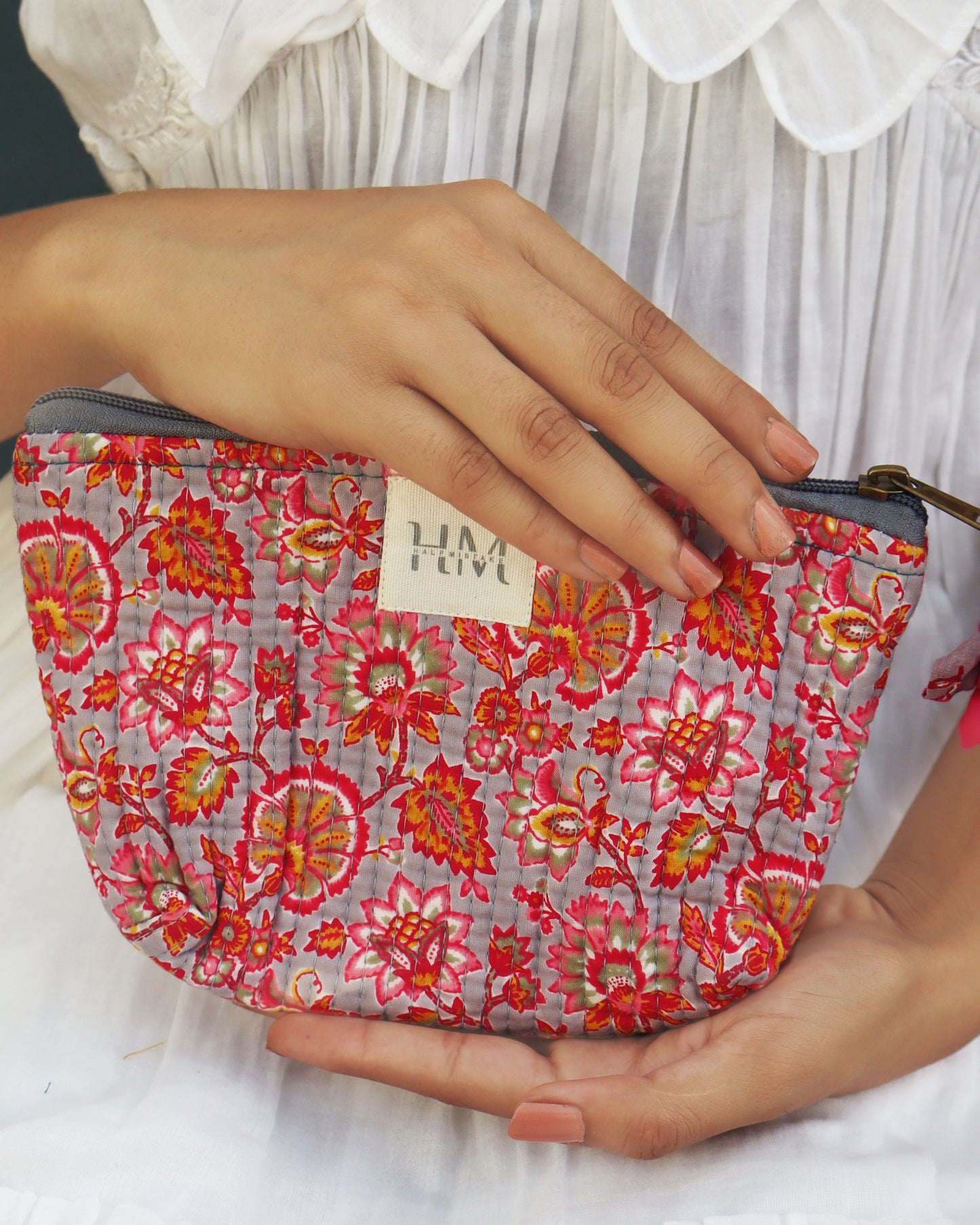 We have a little flower pattern pouch that's ideal for holding your keys, cash, and phone. Its lightweight cotton fabric and button closure make it the perfect bag for stylishly and conveniently carrying adorable tiny objects.