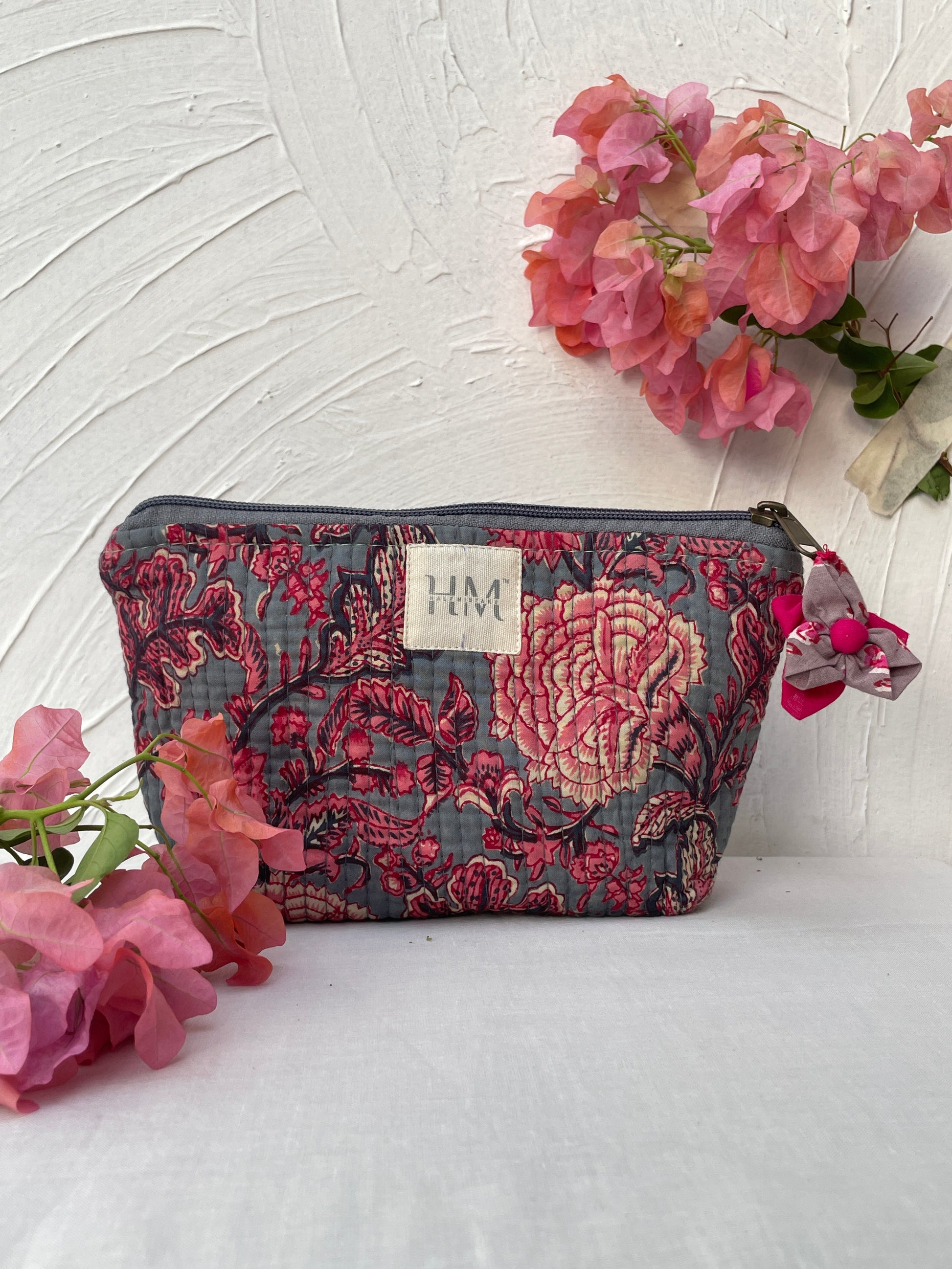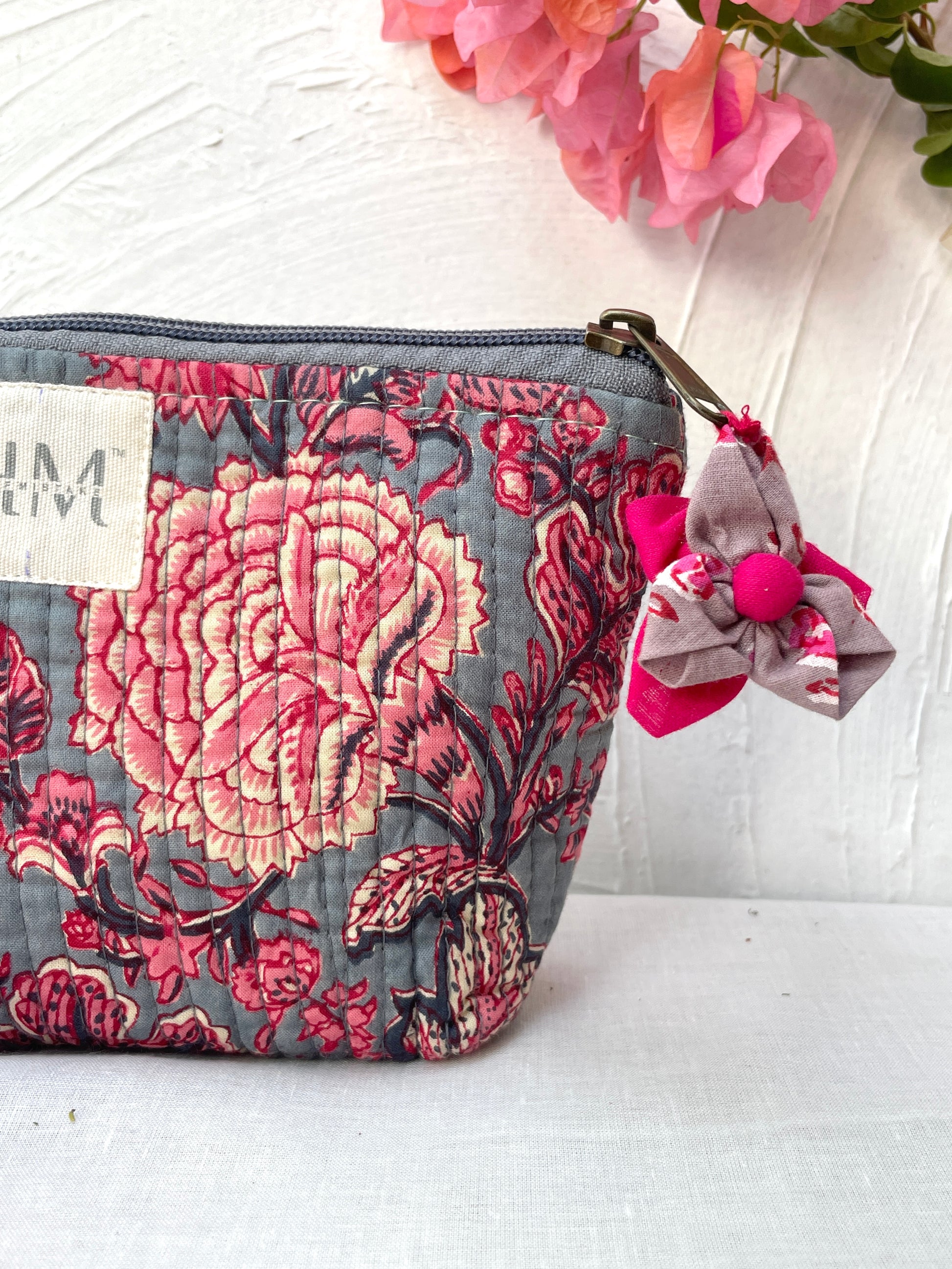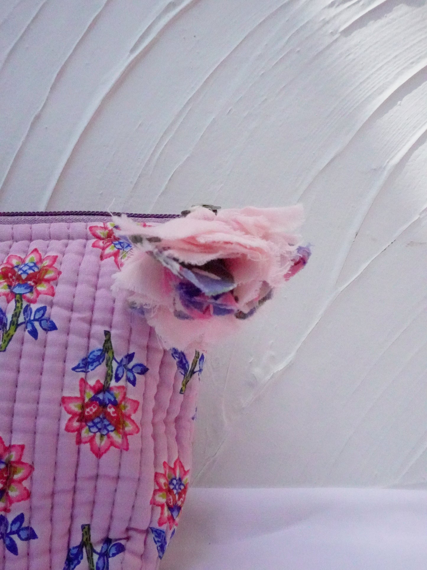 Flower print, elastic loop, zipper tie with little hanging attach with handmade flower tassels, hidden pockets |