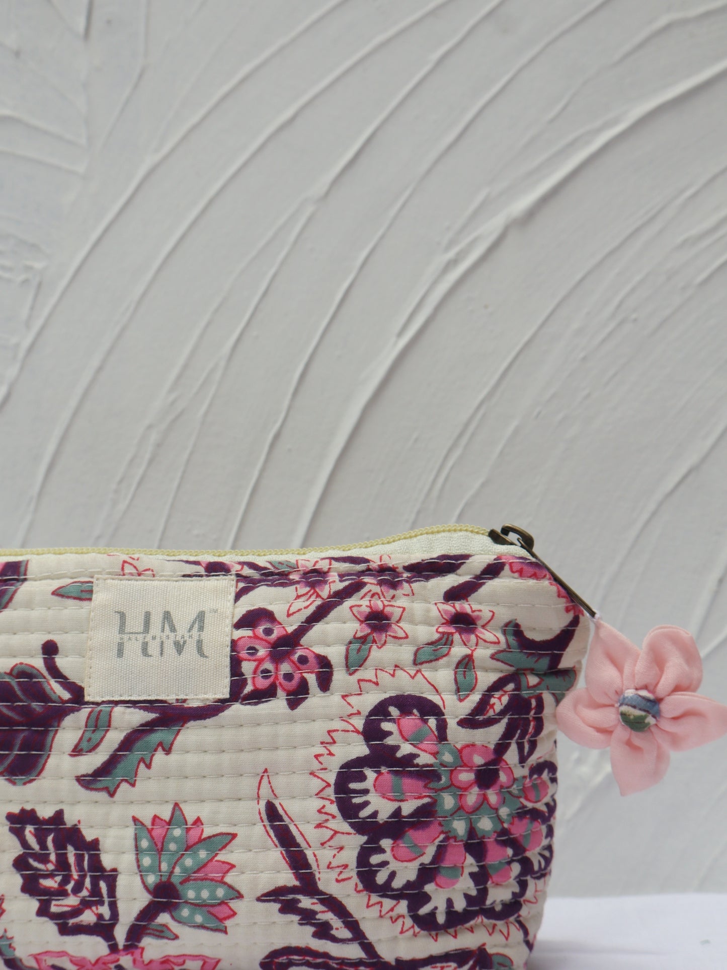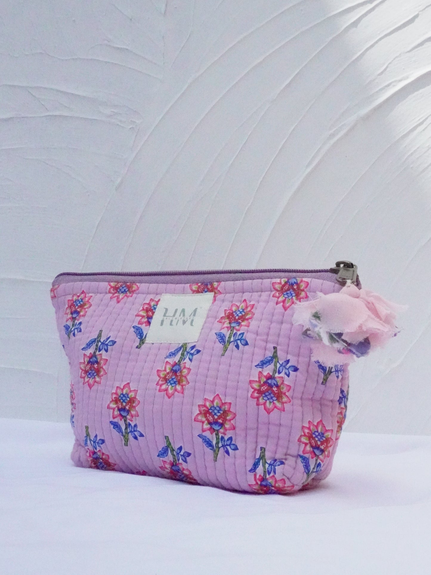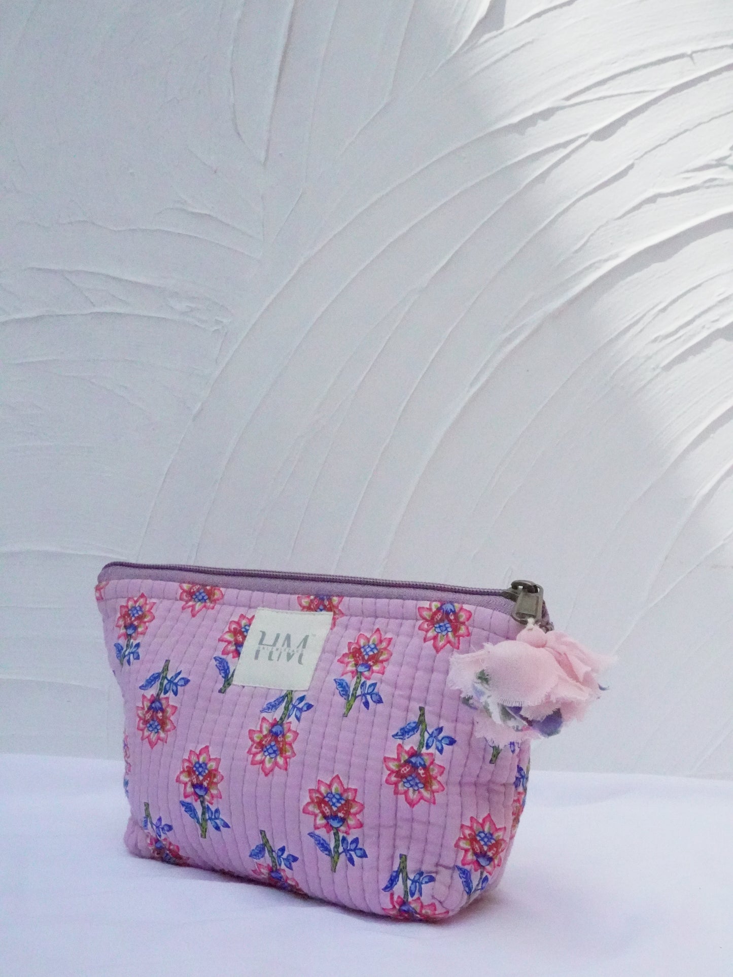 Flower print, elastic loop, zipper tie with little hanging attach with handmade flower tassels, hidden pockets |