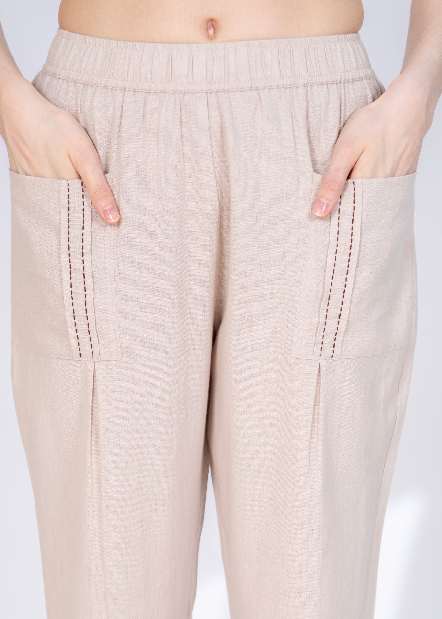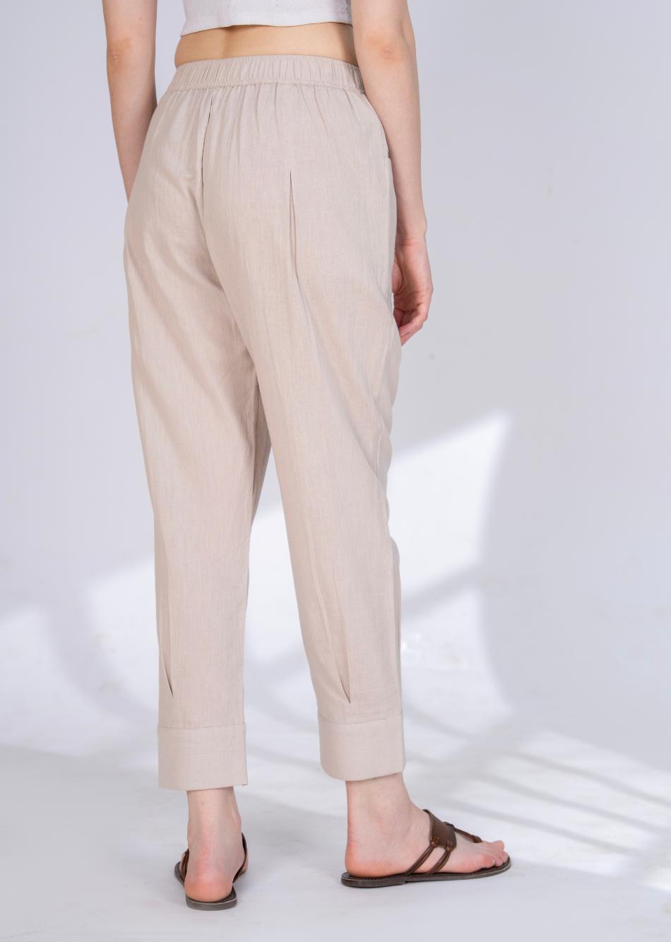 The design features delicate thread running, neat pleats at the front, and cuffed hem gives relaxed silhouette. front pocket adds ease, while the elasticated waistband ensures flexible fit.