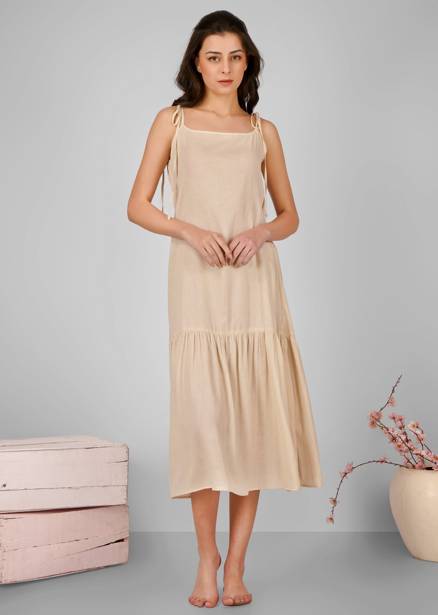 This beige strappy ankle-length dress features elegant gathers adorned with delicate moti running. A stylish side slit adds flair, while the shoulder tie-up design brings a playful charm. Perfectly blending grace and comfort.