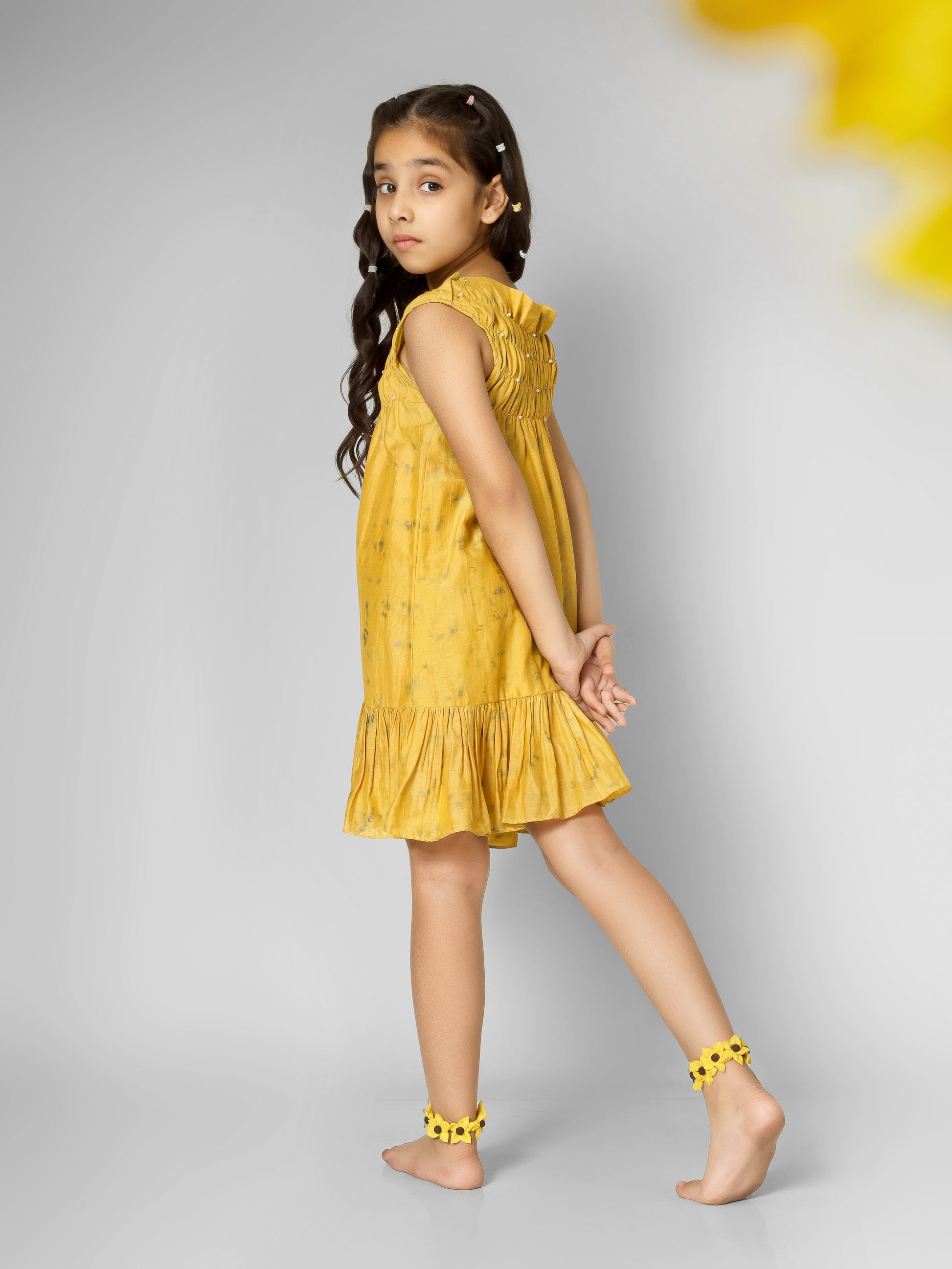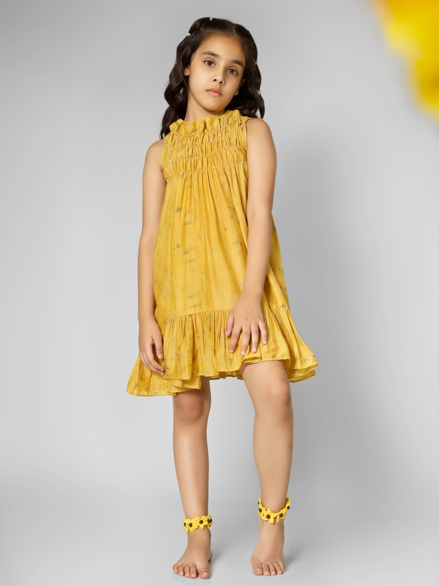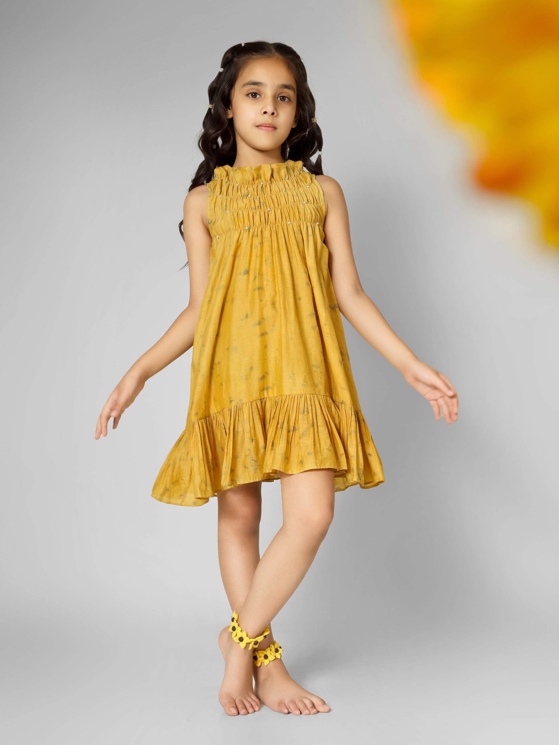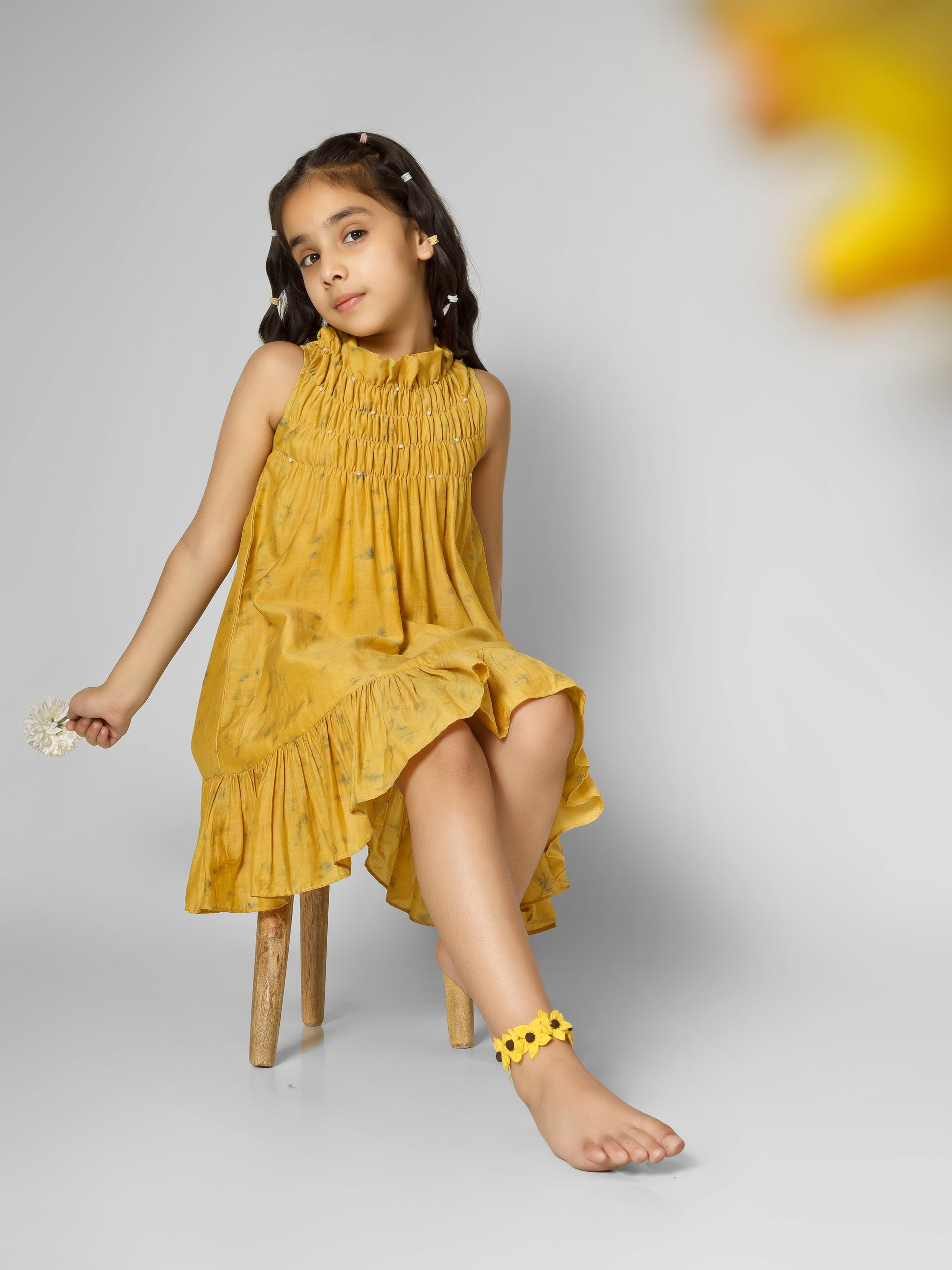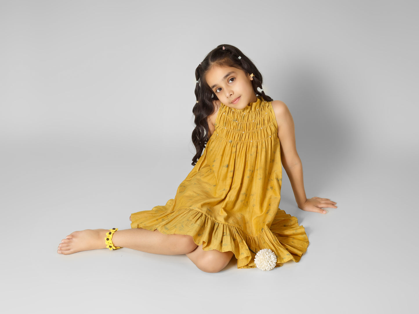 The smocked elastic bodice offers a flattering, flexible fit, while the gentle gathers from the waist create a soft, twirl-worthy silhouette. Finished with delicate handmade details, this piece captures the soul of sustainable ethnic wear.