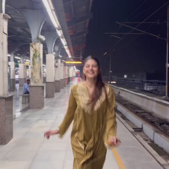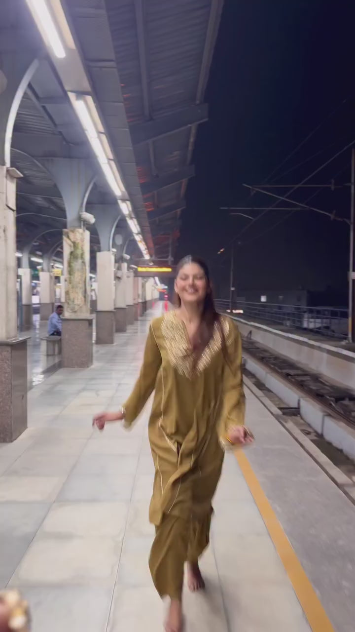 This brown kurta has loose sleeves and a lovely machine-worked gotta patti design. Small designs adorn the shalwar, while the dupatta is beautifully completed with handmade tassels, cutwork laces, and moti chidkav.