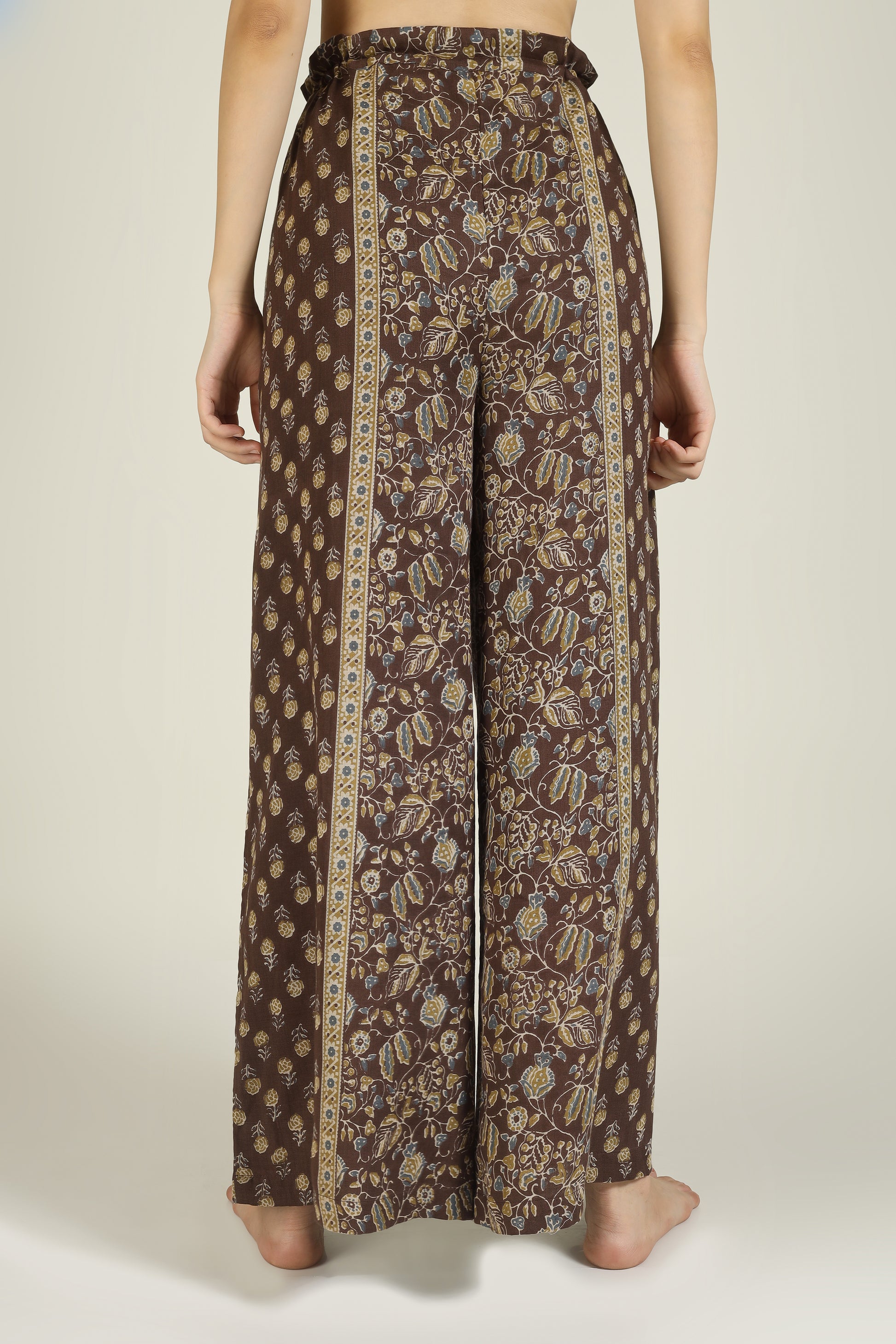 Check out these super comfy brown printed pants! They come with a cute all-over print and a stretchable waistband that makes them perfect for all-day wear. The breezy palazzo fit adds a stylish touch.