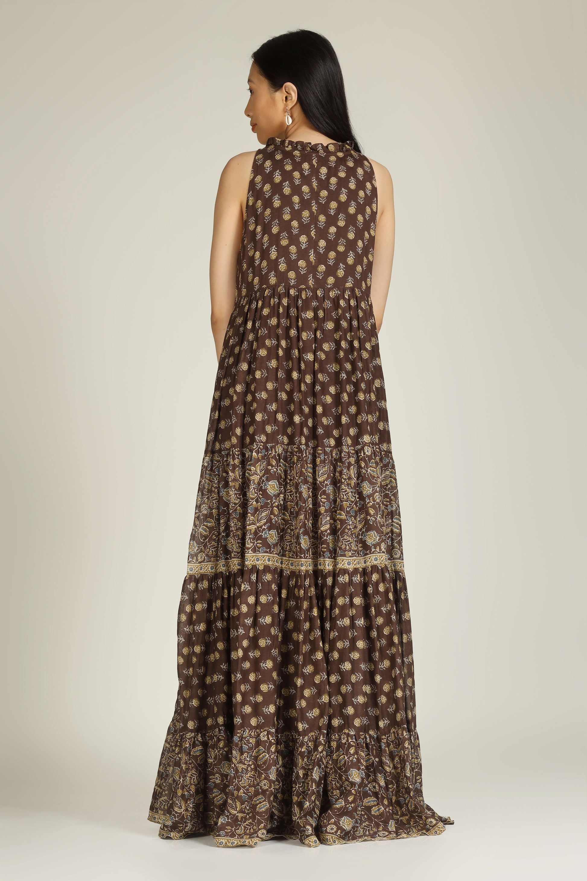 This brown printed gown radiates elegance with its ruffle neck, gathered tiers, and front dori tie adorned with fringed tassels, offering a graceful flow and timeless ethnic charm.