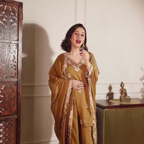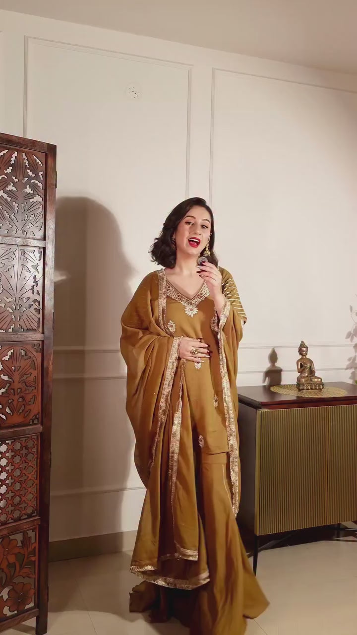 This brown kurta has tiny patterns all over the fabric and on the collar, which are finely embroidered. Gotta lines bring notice to the sharara, and the dupatta's moti chidkav and lace details in the corners enhance grace.