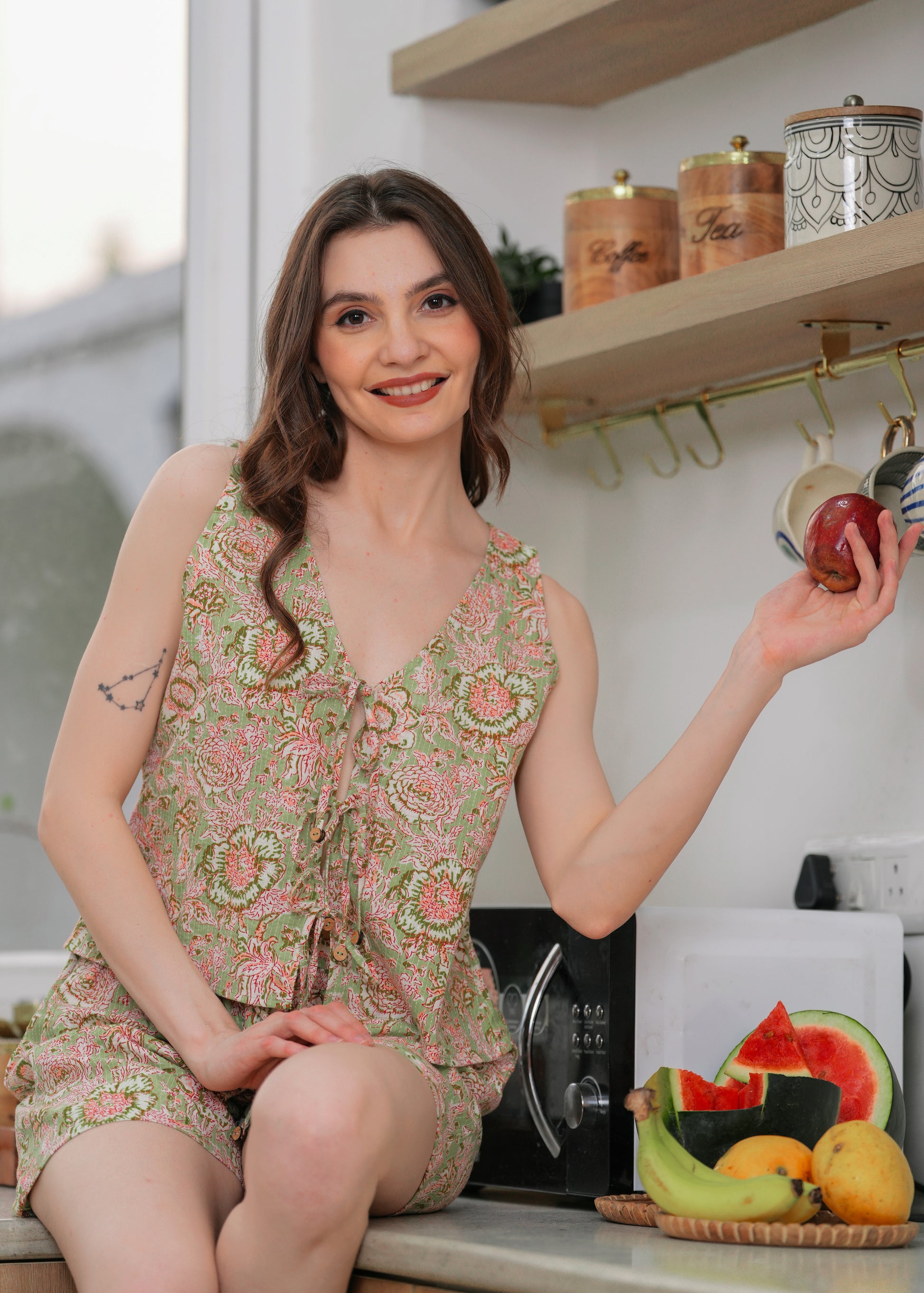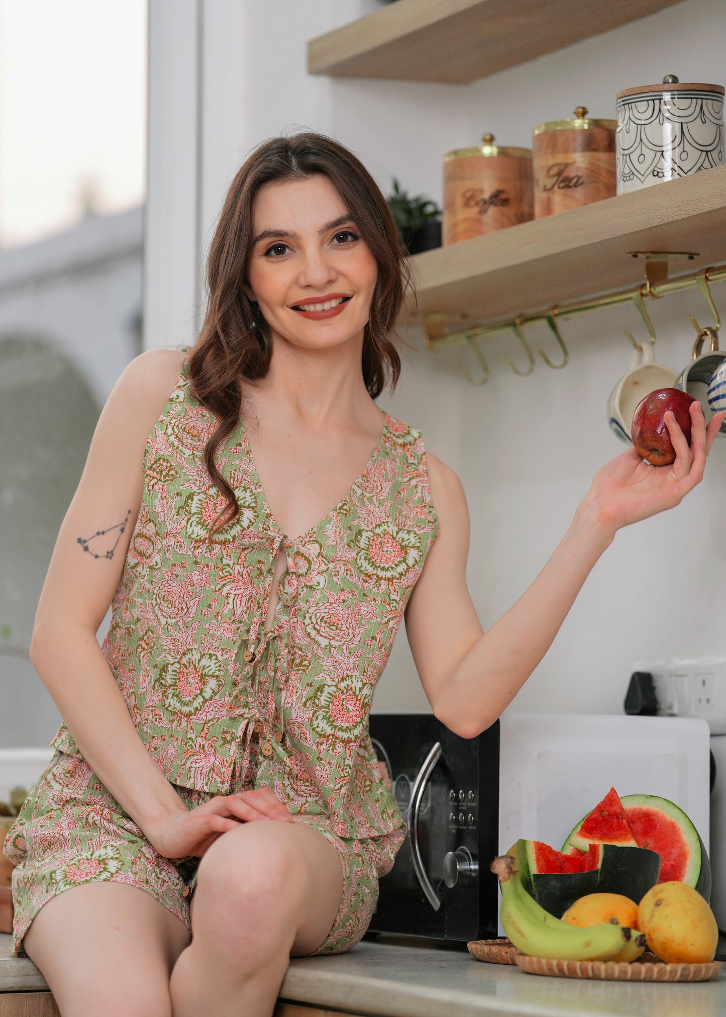 Green Printed Sleepwear Set with Front Knot