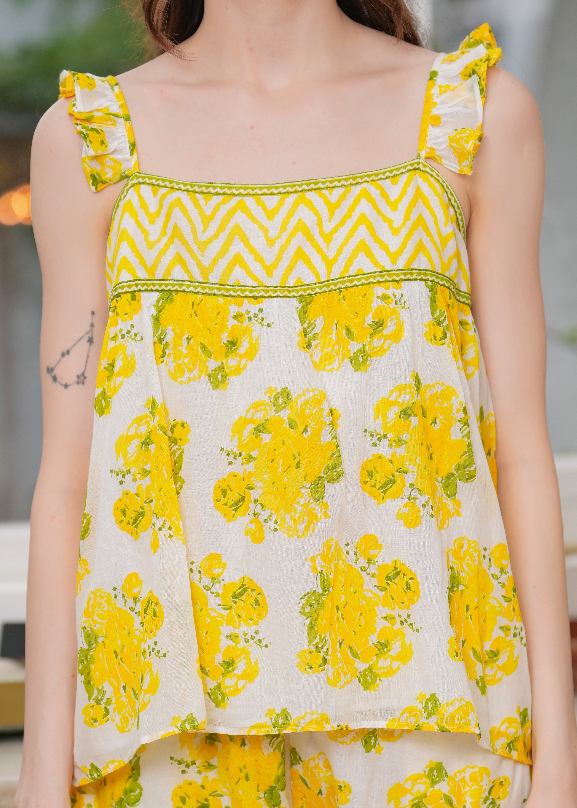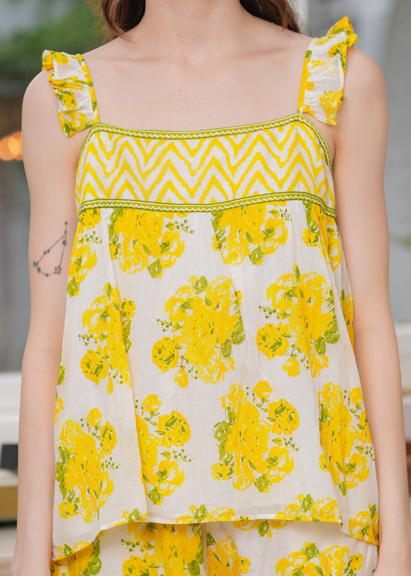 A breezy blend of modern ease and ethnic charm. Made from ultra-soft fabric this co-ord set features delicate floral prints. The top comes with easy ruffle straps and a relaxed fit, while the coordinating shorts have an elasticated waist, ruffle detailing at end for comfort.