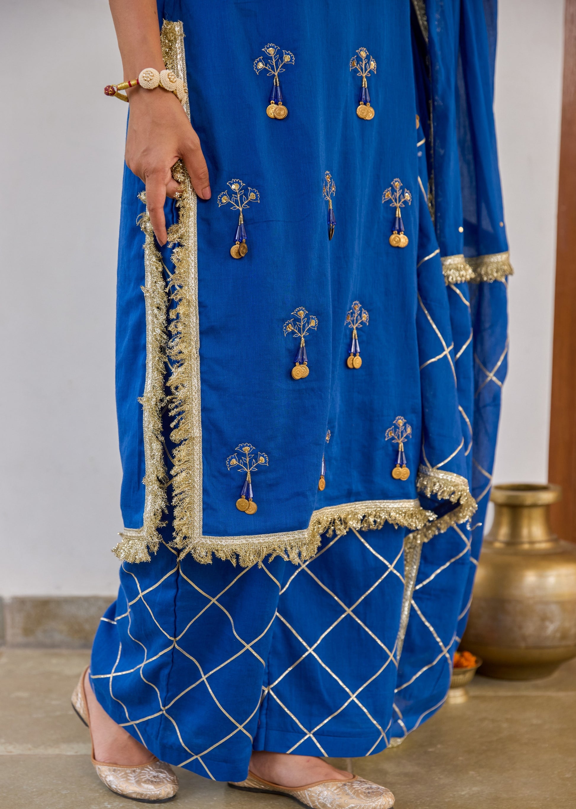 Soft mulmul fabric in vibrant neer royal blue colour, featuring a deep back keyhole with handmade hangings that reflect Jaipur’s handcrafted charm. The palazzo glimmers with gotta work, while the dupatta’s panel detailing pays homage to the city’s rich heritage.