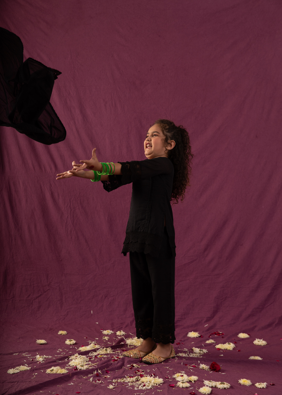 This small girl packs a world of charm. Overflowing with cuteness, her presence is a delight. Fun-sized and fabulous, she's a little burst of joy in every moment. Be ready to shine by wear our black straight suit set! The kurta's got pintucks with moti detailing and lace at the neck, plus double lace on the sleeves. Pants has double lace at the ends with a hint of moti magic. Dupatta is adorned with lace details.
