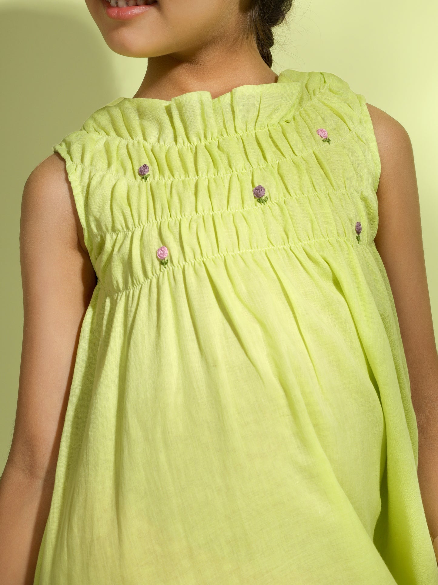 This dress features gathered edges, The neckline is an elastic collar beautifully adorned with hand-embroidered floral motifs.