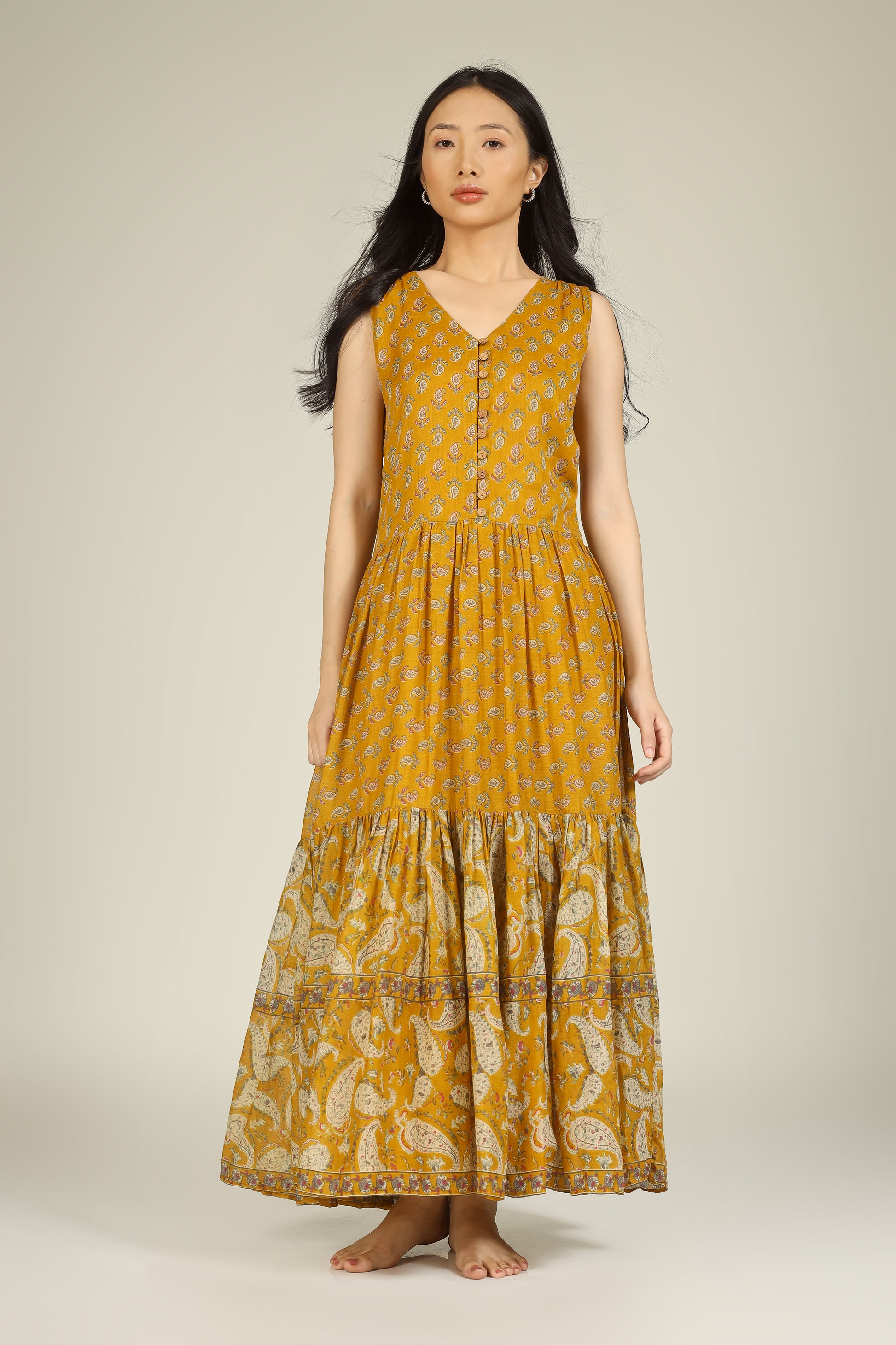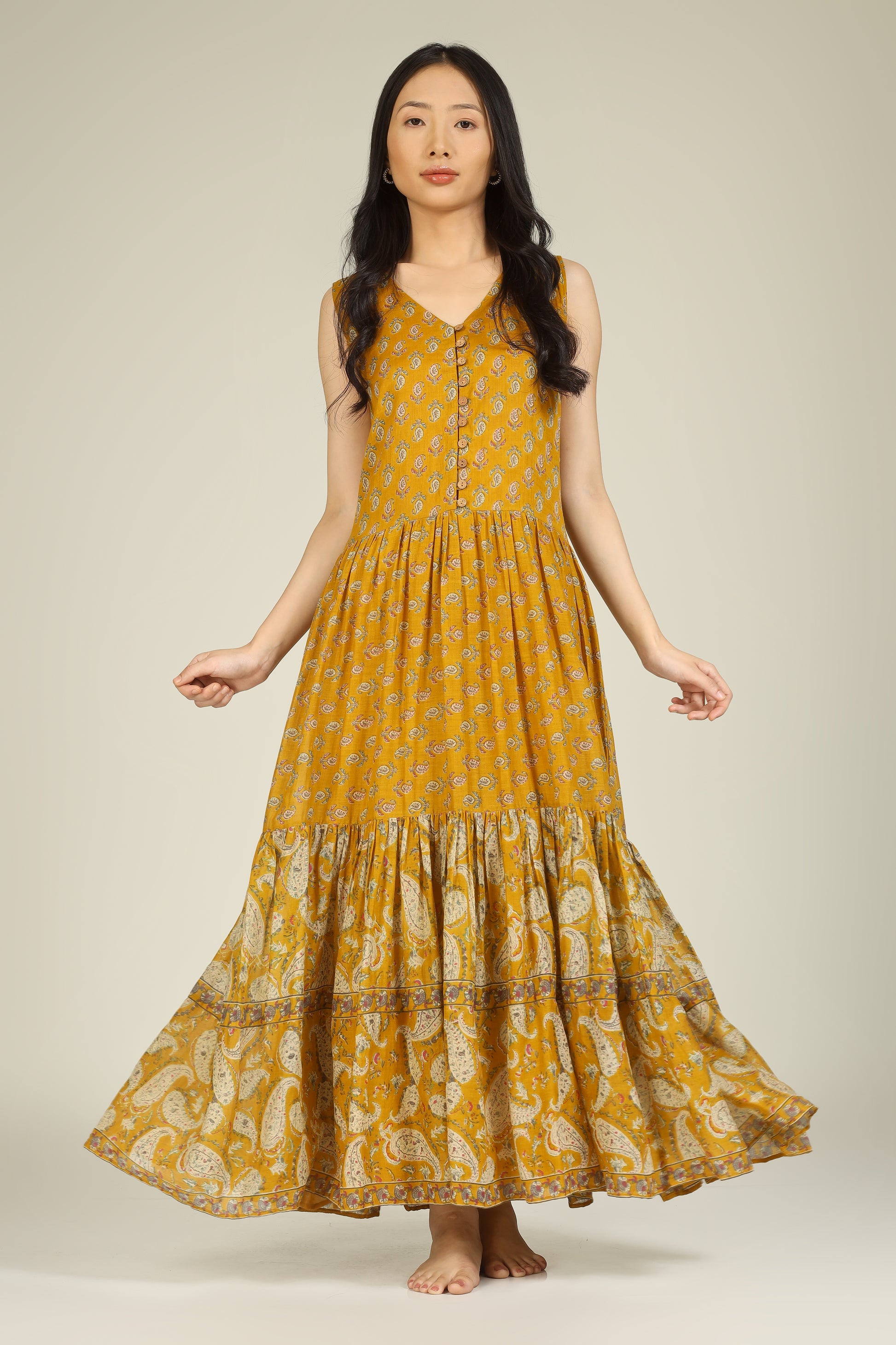 This mustard printed sleeveless maxi dress features two-tier flared design with soft gathers and button details on the bodice.