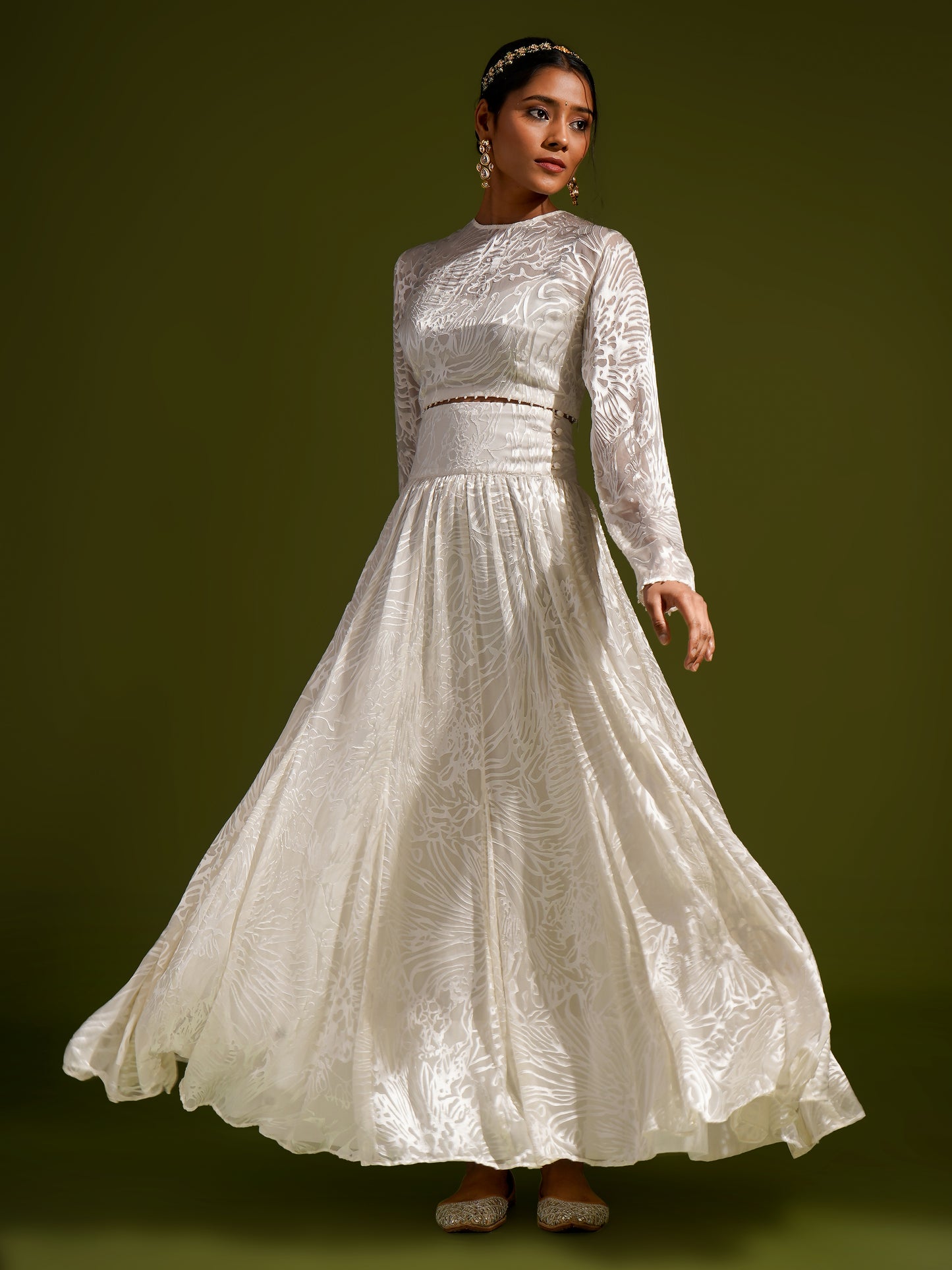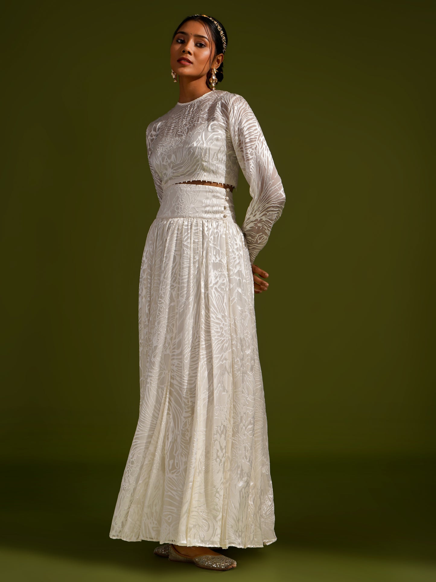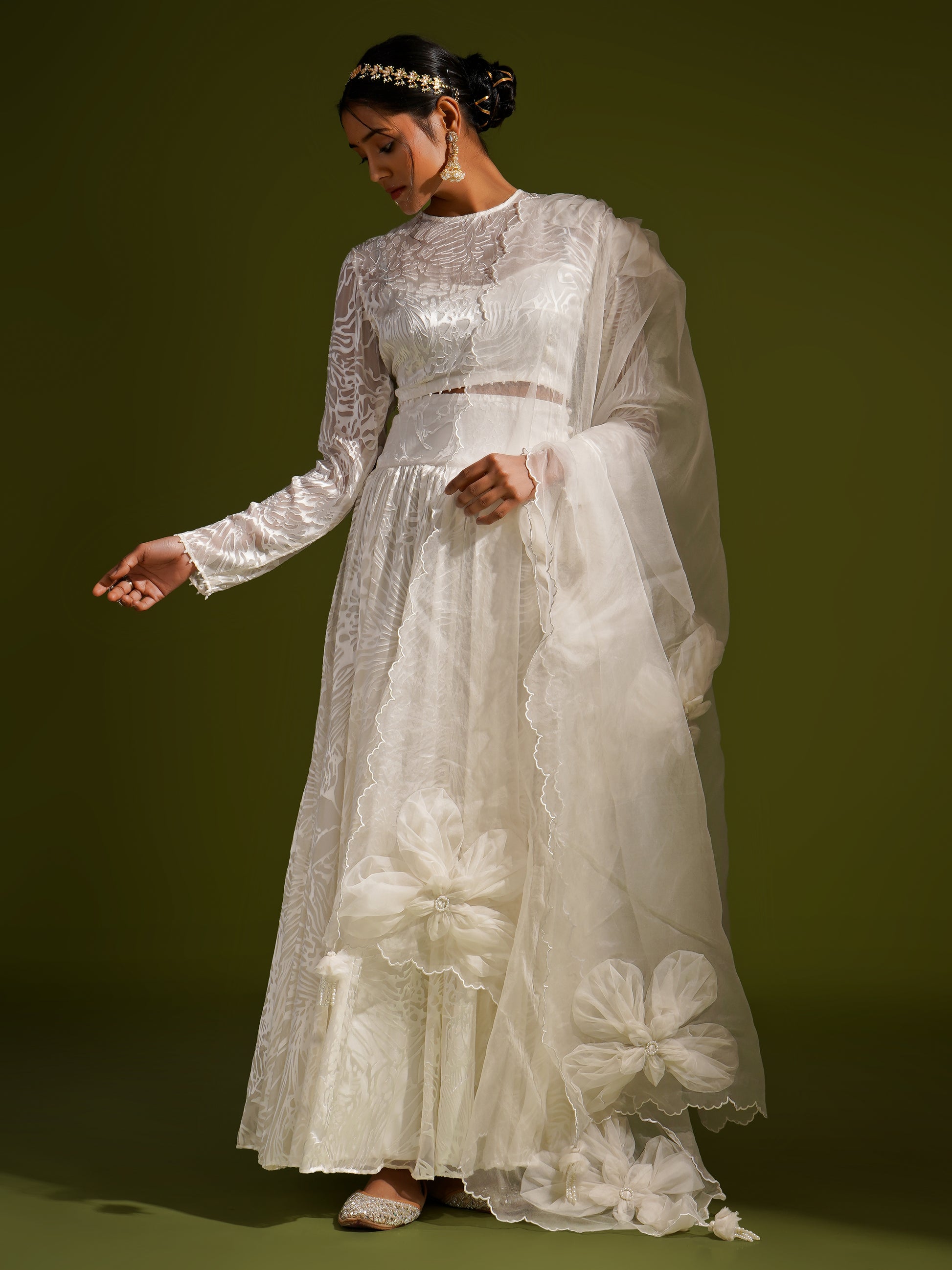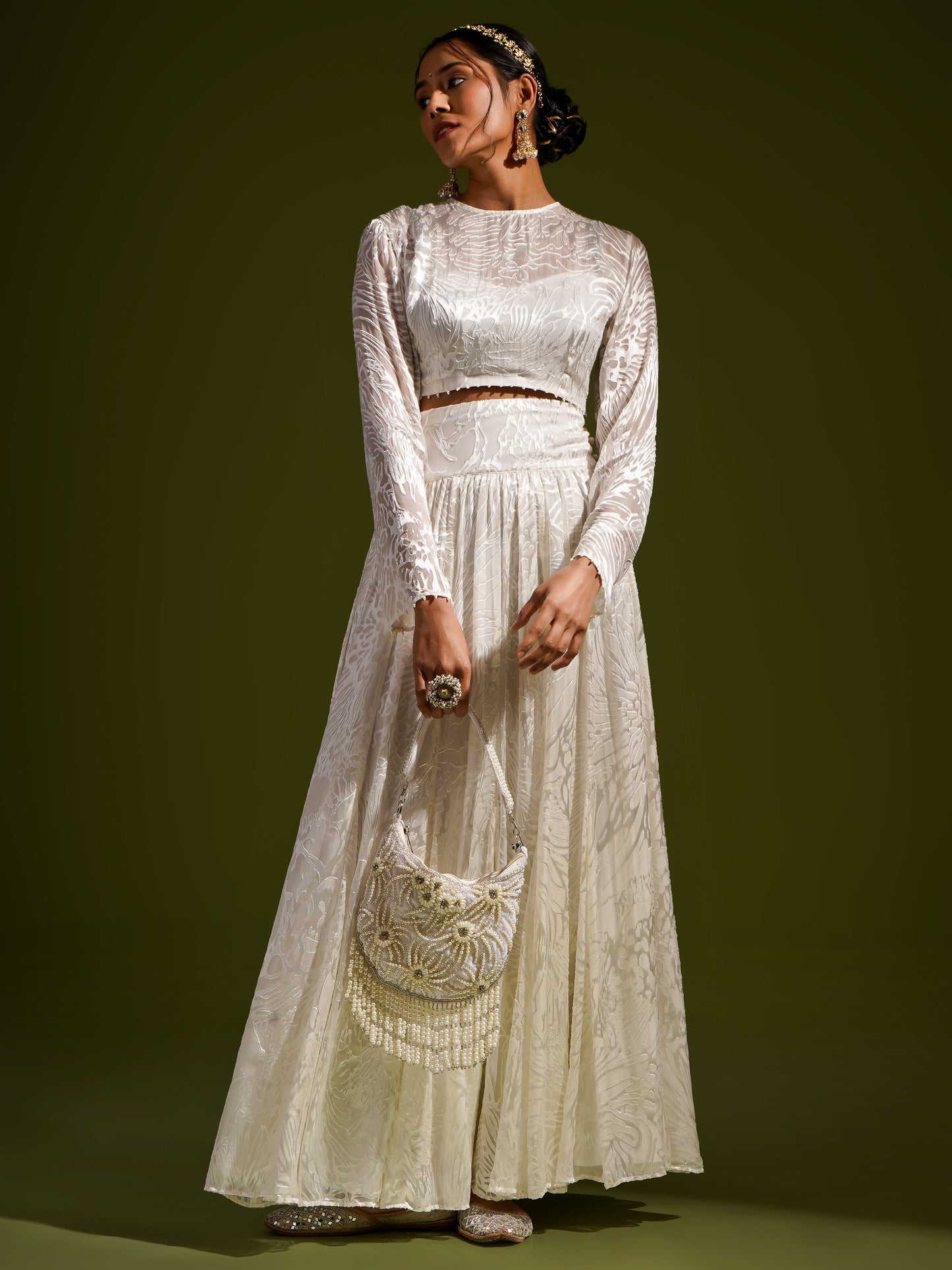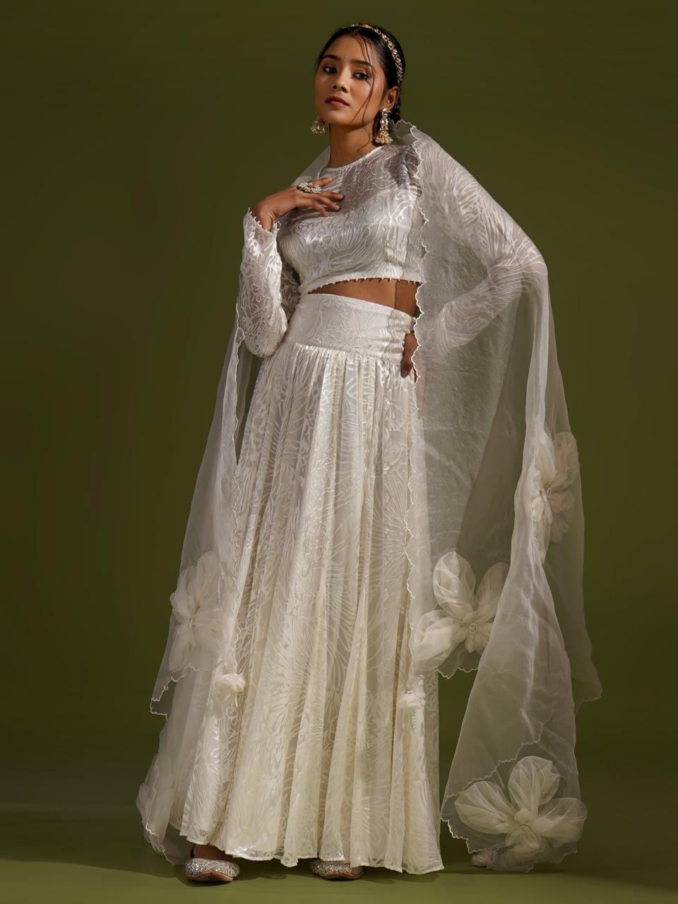 Top with moti detailing, high waist skirt, fabric flower enhancement on dupatta. |