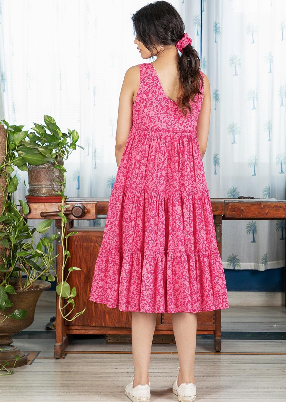 A pretty sleeveless dress with a mid-calf length print in pink. Gathers at the waist and exquisite moti embroidery on the body and neck edges highlight this three-tier dress.