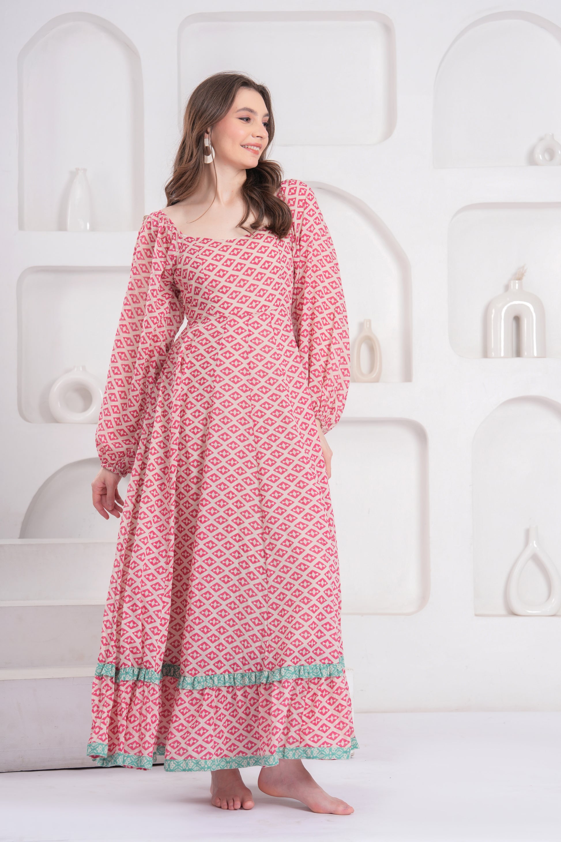 This brown mulmul maxi dress features an abstract print, square neck, full balloon elastic sleeves, back zip with button, kali detailing, two flowy tiers, and printed patti accents at the hem.
