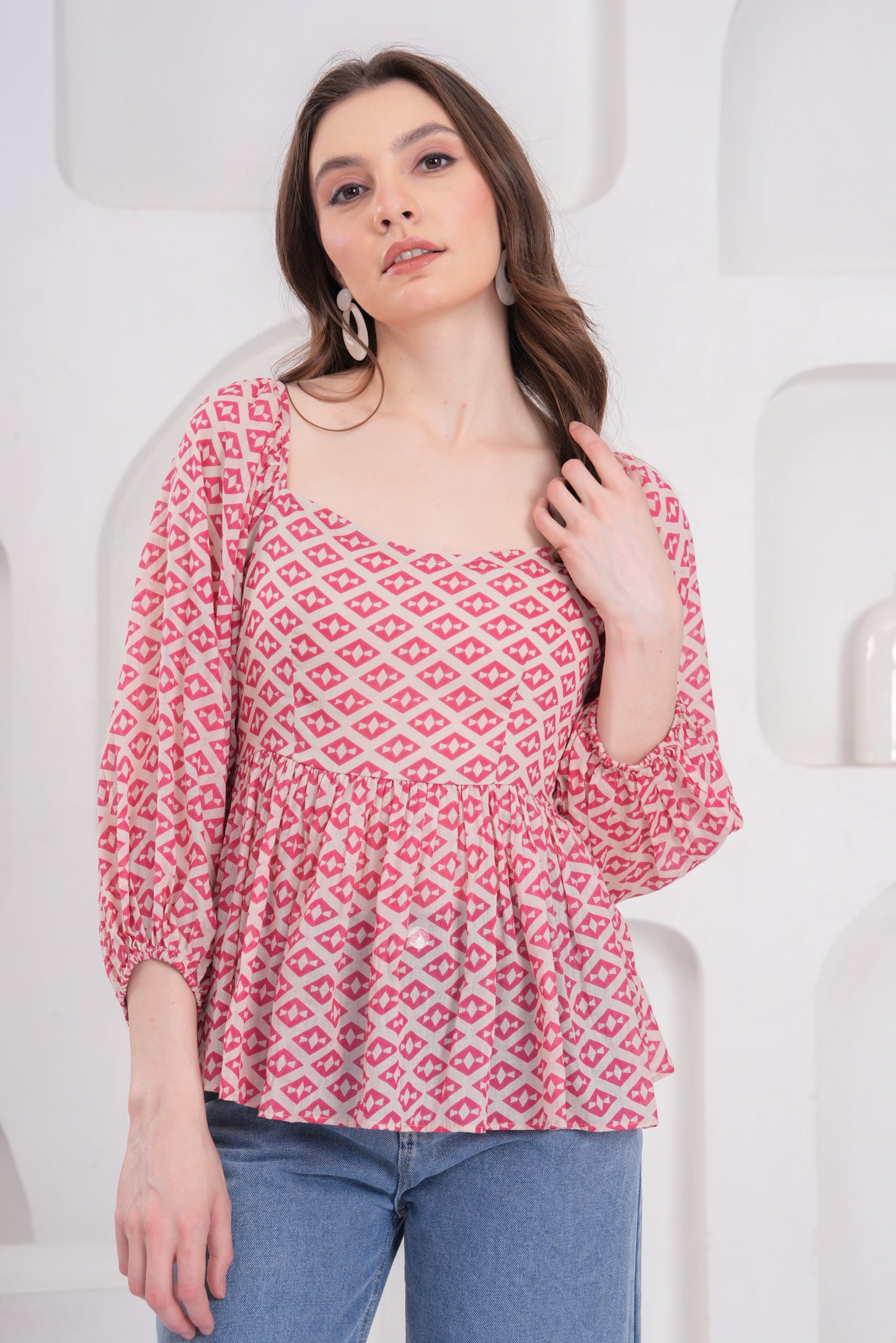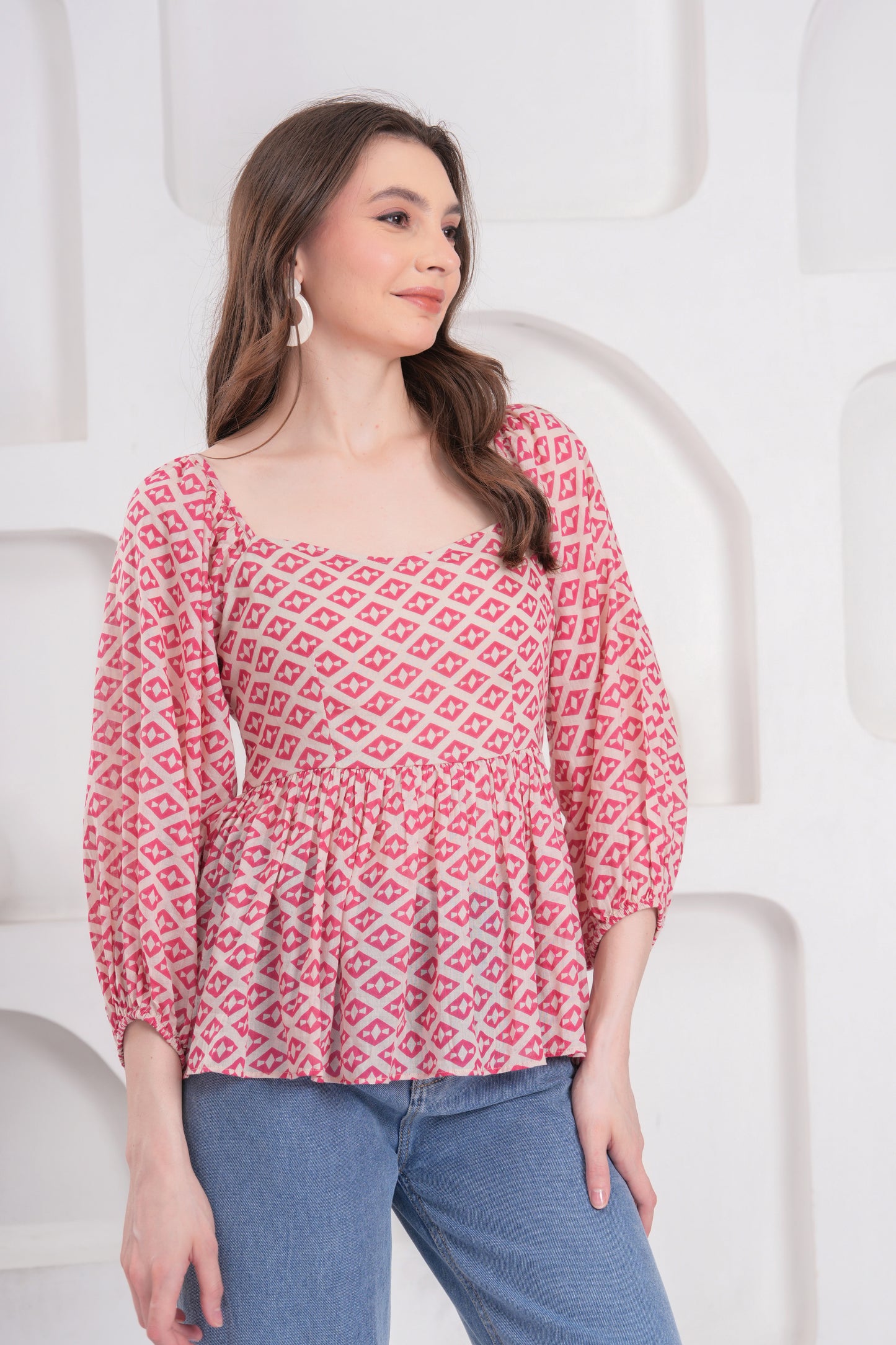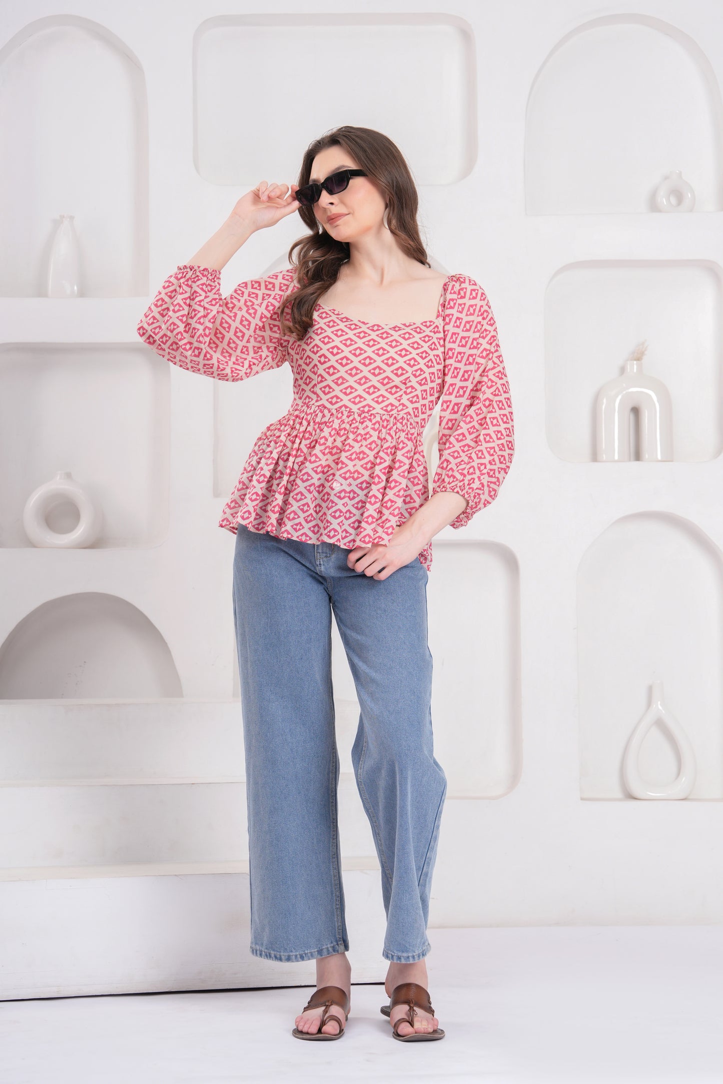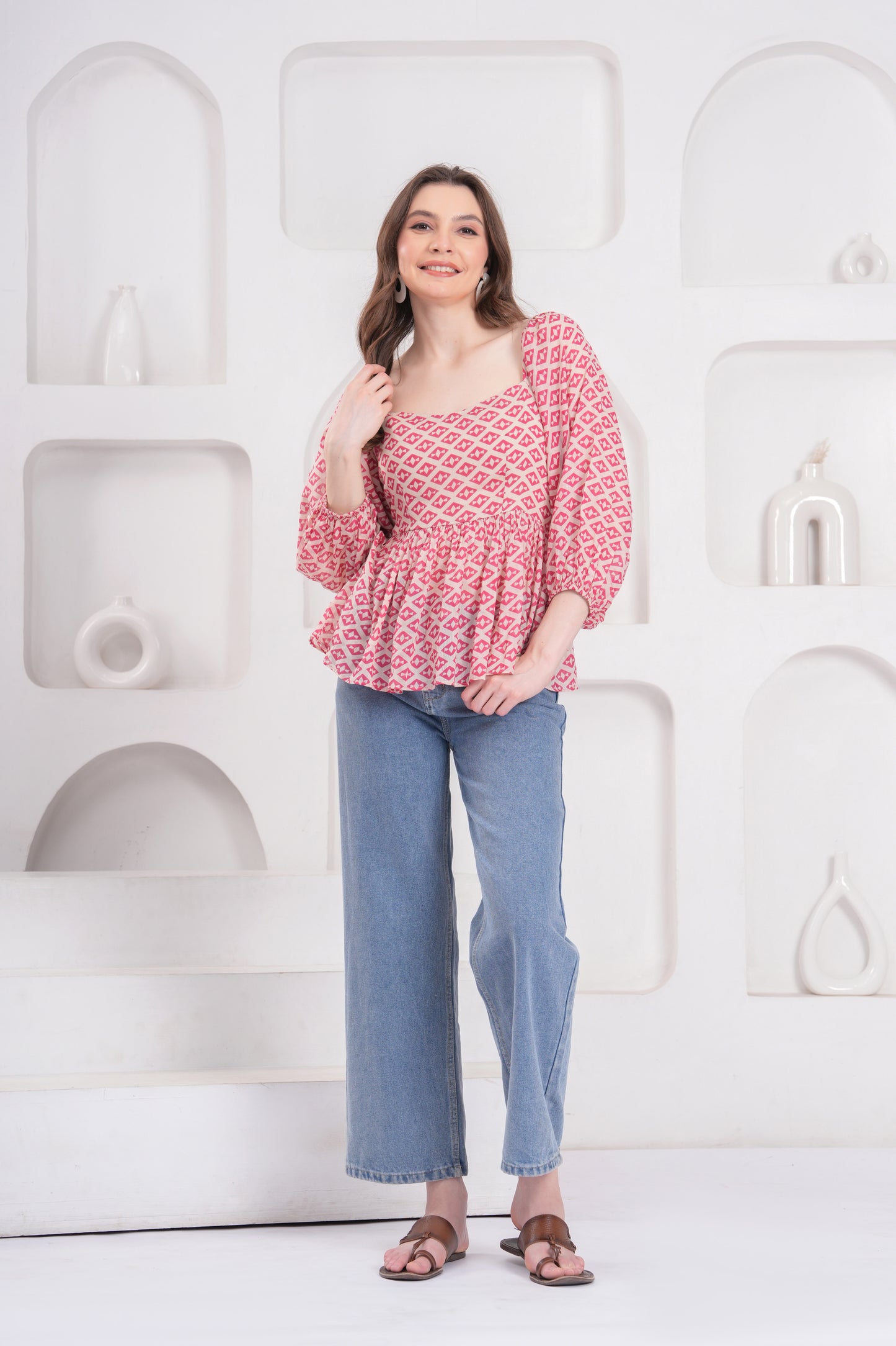 This abstract printed pink mulmul crop top features a flattering square neckline, soft gathers from the waist, and stylish elastic balloon sleeves, blending comfort with playful charm for a chic everyday look.