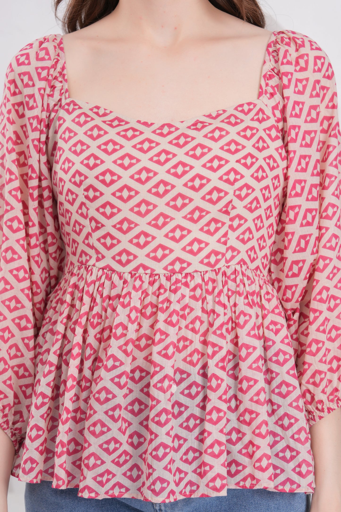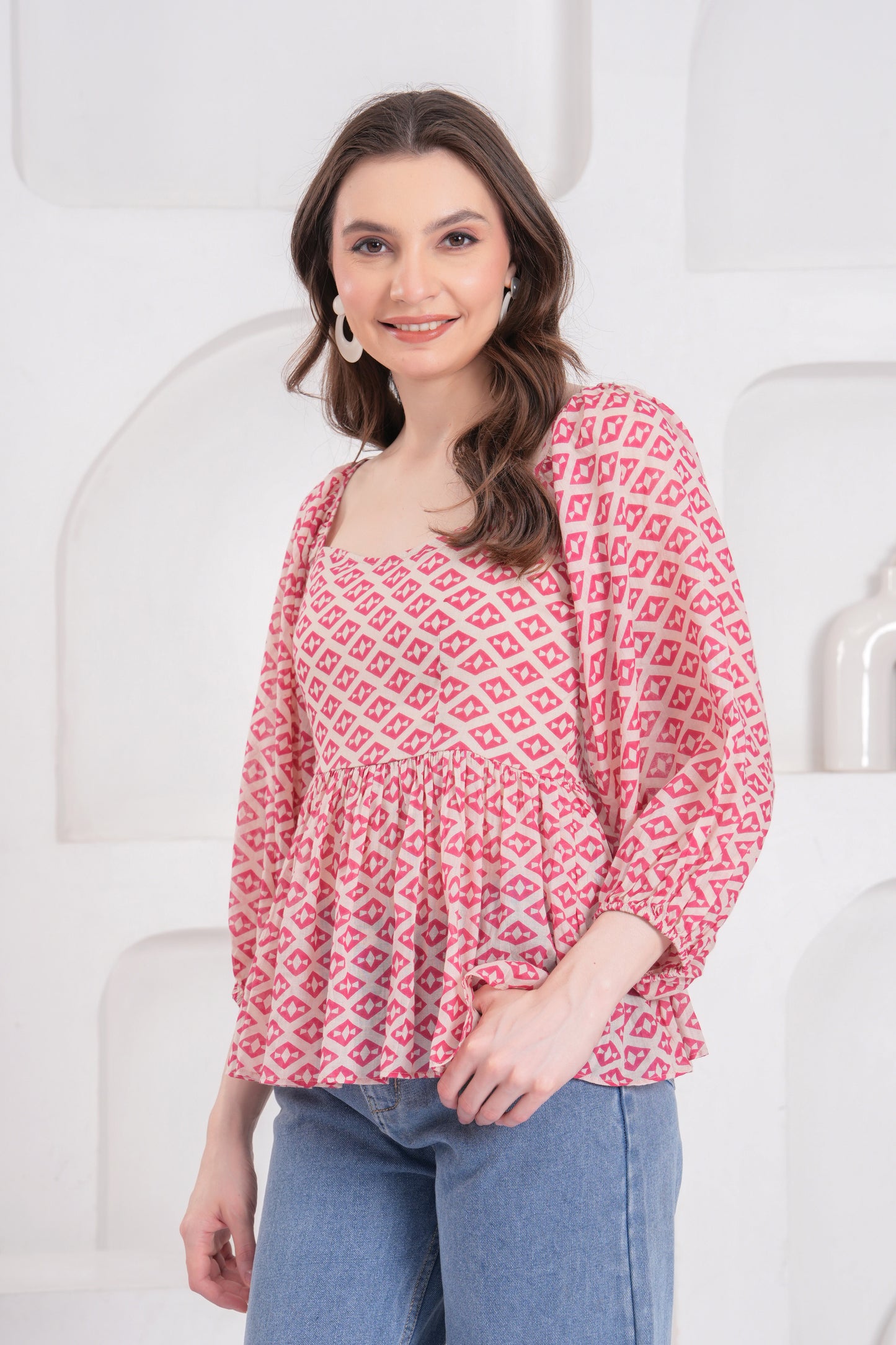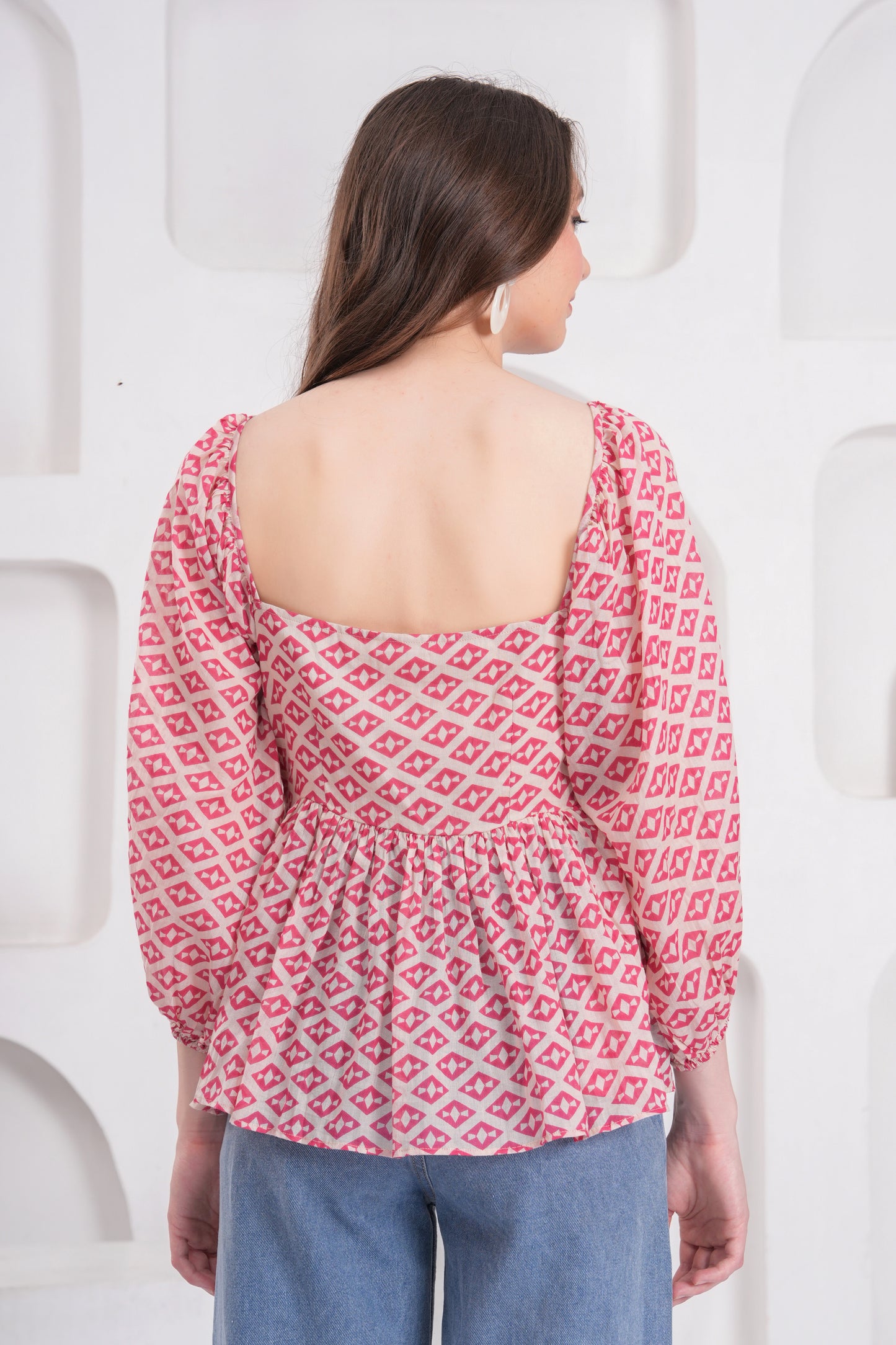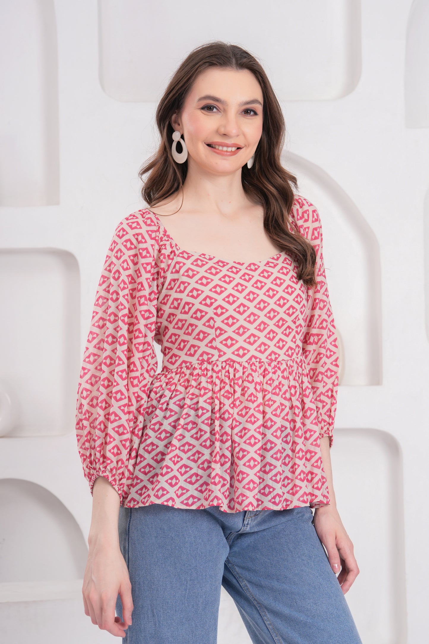 This abstract printed pink mulmul crop top features a flattering square neckline, soft gathers from the waist, and stylish elastic balloon sleeves, blending comfort with playful charm for a chic everyday look.