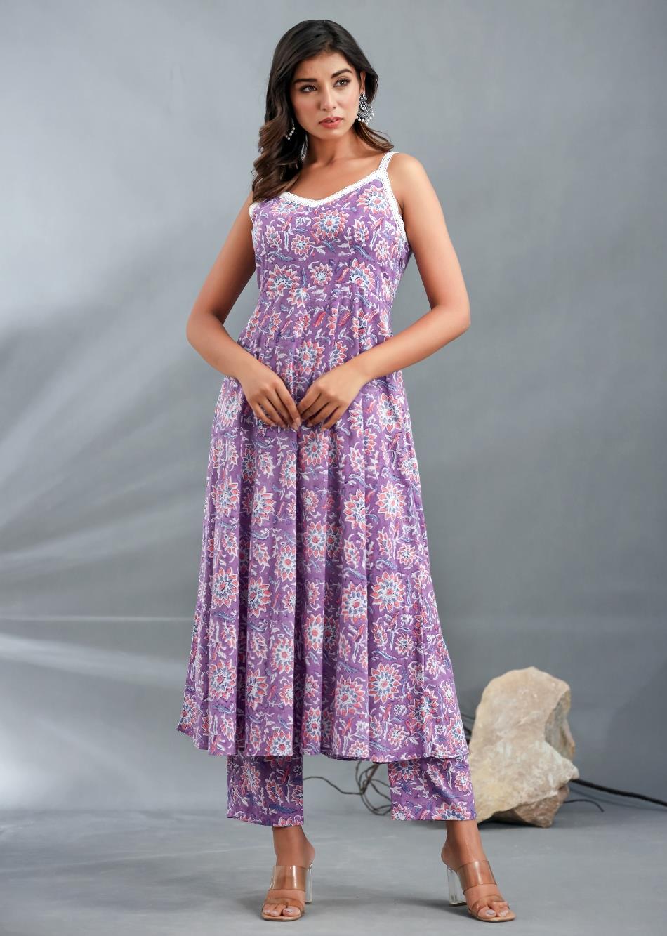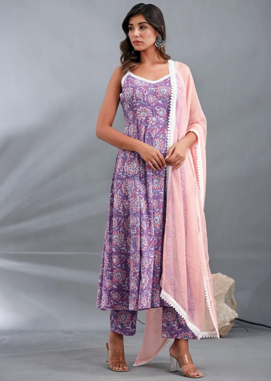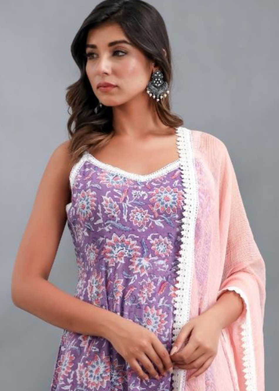 This purple-pink suit set will turn heads. It includes a sleeveless cotton kurta with all-over designs, a V-neckline, and lace details. paired with a Kota Doria dupatta adorned with intricate lacework and matching printed cotton pants.