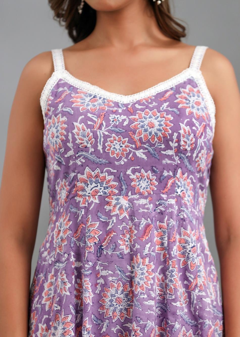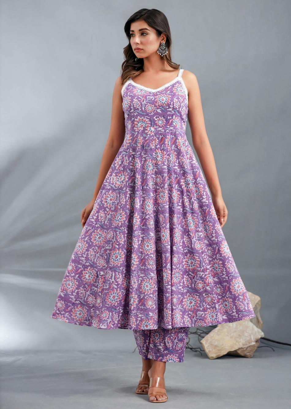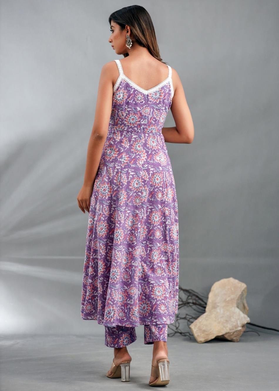 This purple-pink suit set will turn heads. It includes a sleeveless cotton kurta with all-over designs, a V-neckline, and lace details. paired with a Kota Doria dupatta adorned with intricate lacework and matching printed cotton pants.
