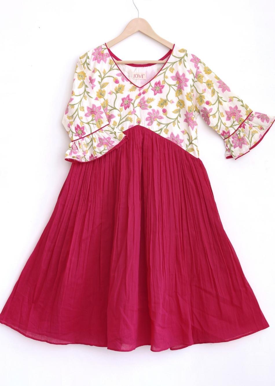 The Rani maxi dress showcases a charming cross gather pattern and a captivating floral body design. With its graceful silhouette, the dress elegantly flares from the waist.