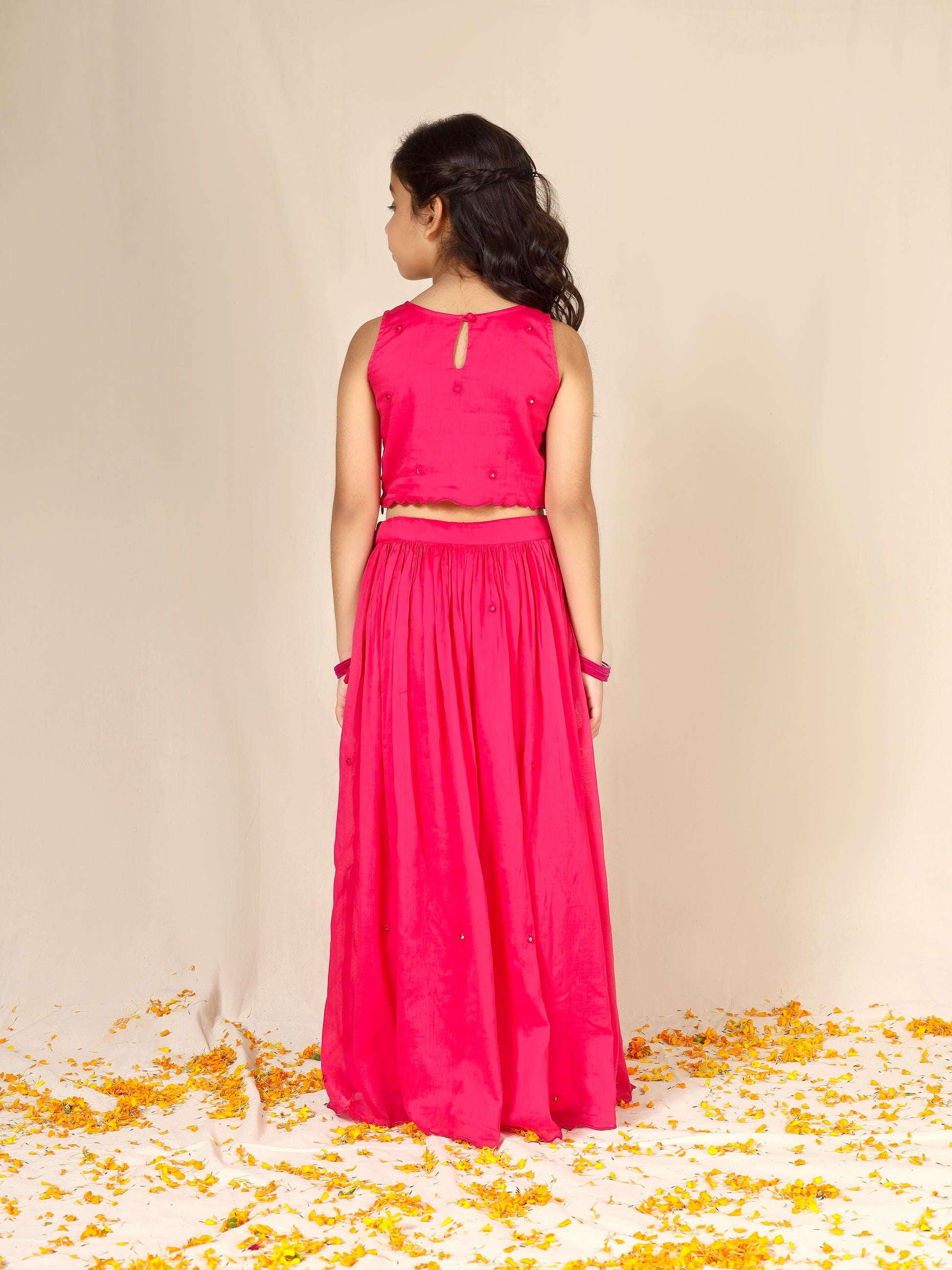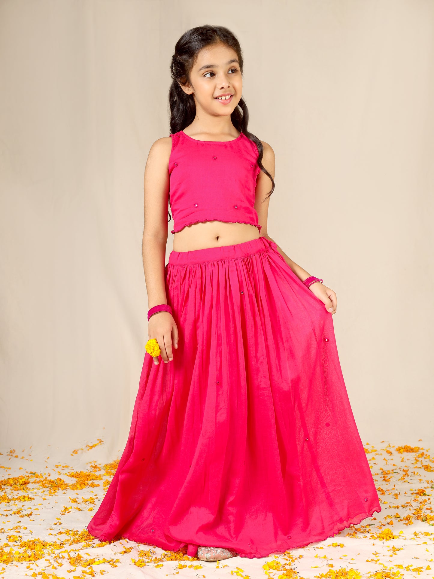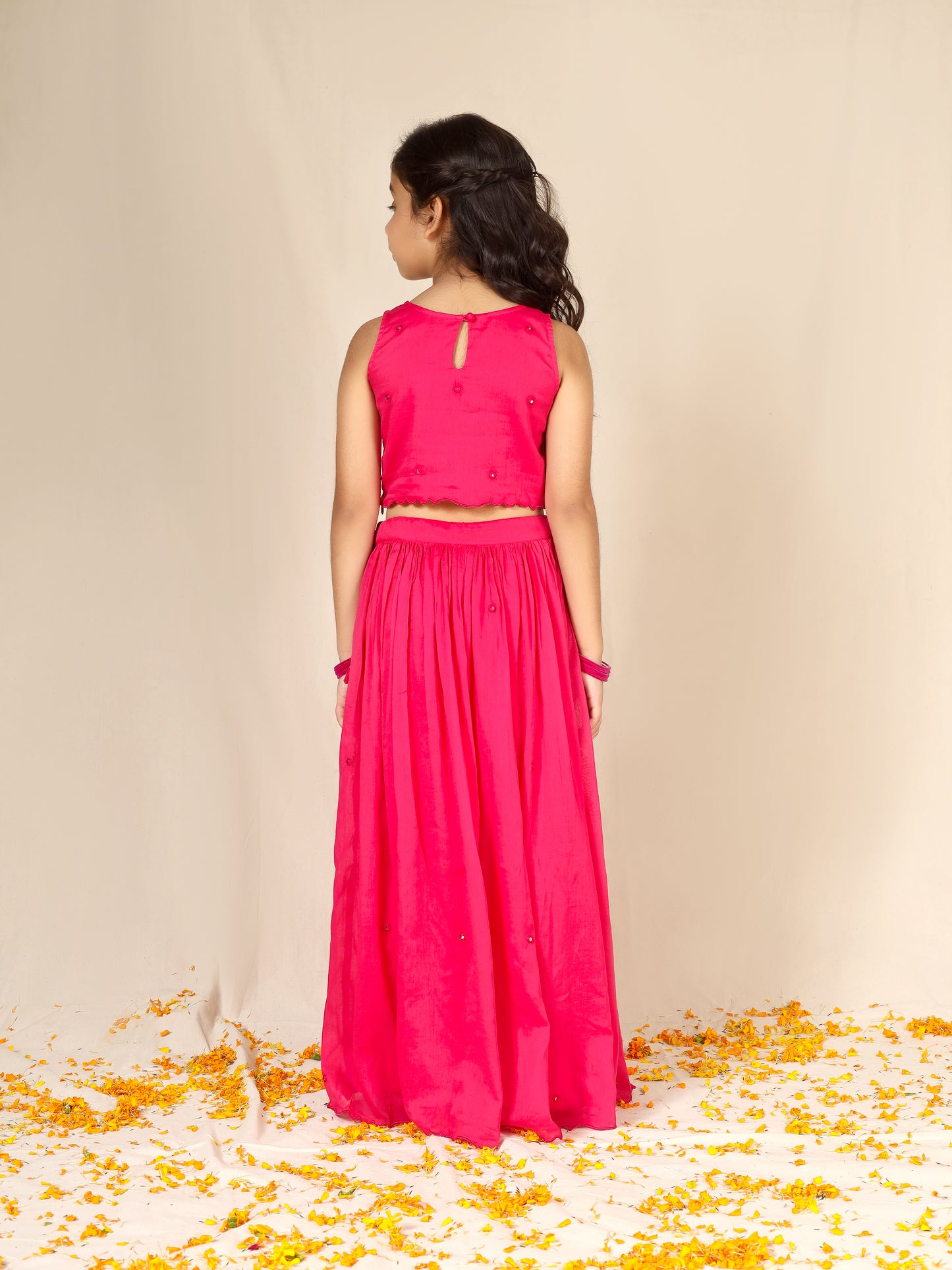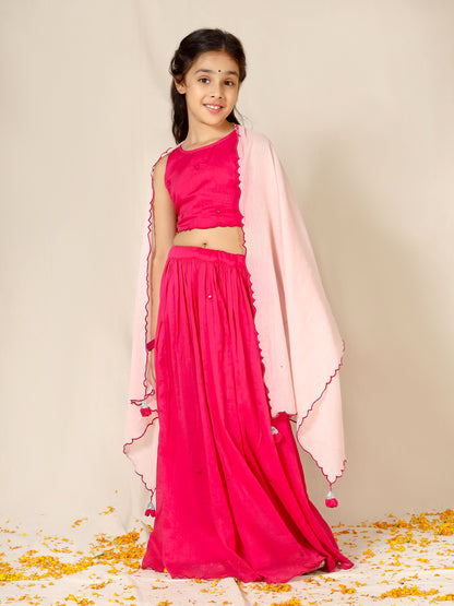 The rani halter top has a back keyhole with a sweet potli and a scallop design with detailed hand embroidered and mirror work. matched with a mirror-work skirt, a stylish dori tie knot, and a dupatta with tassels and moti chidkav.