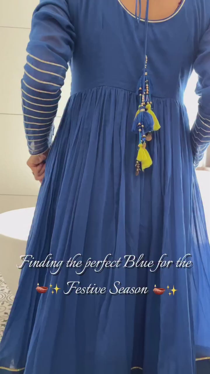 Soft mulmul in neer royal blue colour, hand-embroidered with leaf dabka work that’s pure kala. The round neck stays simple, but those chanchan hangings? They tell their own stories.