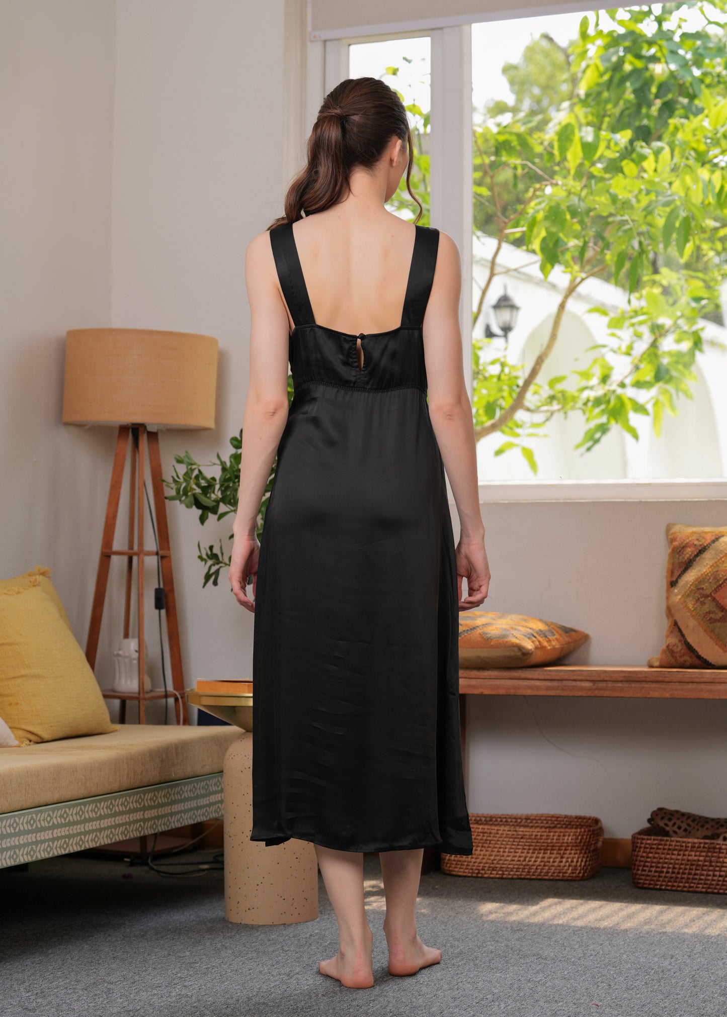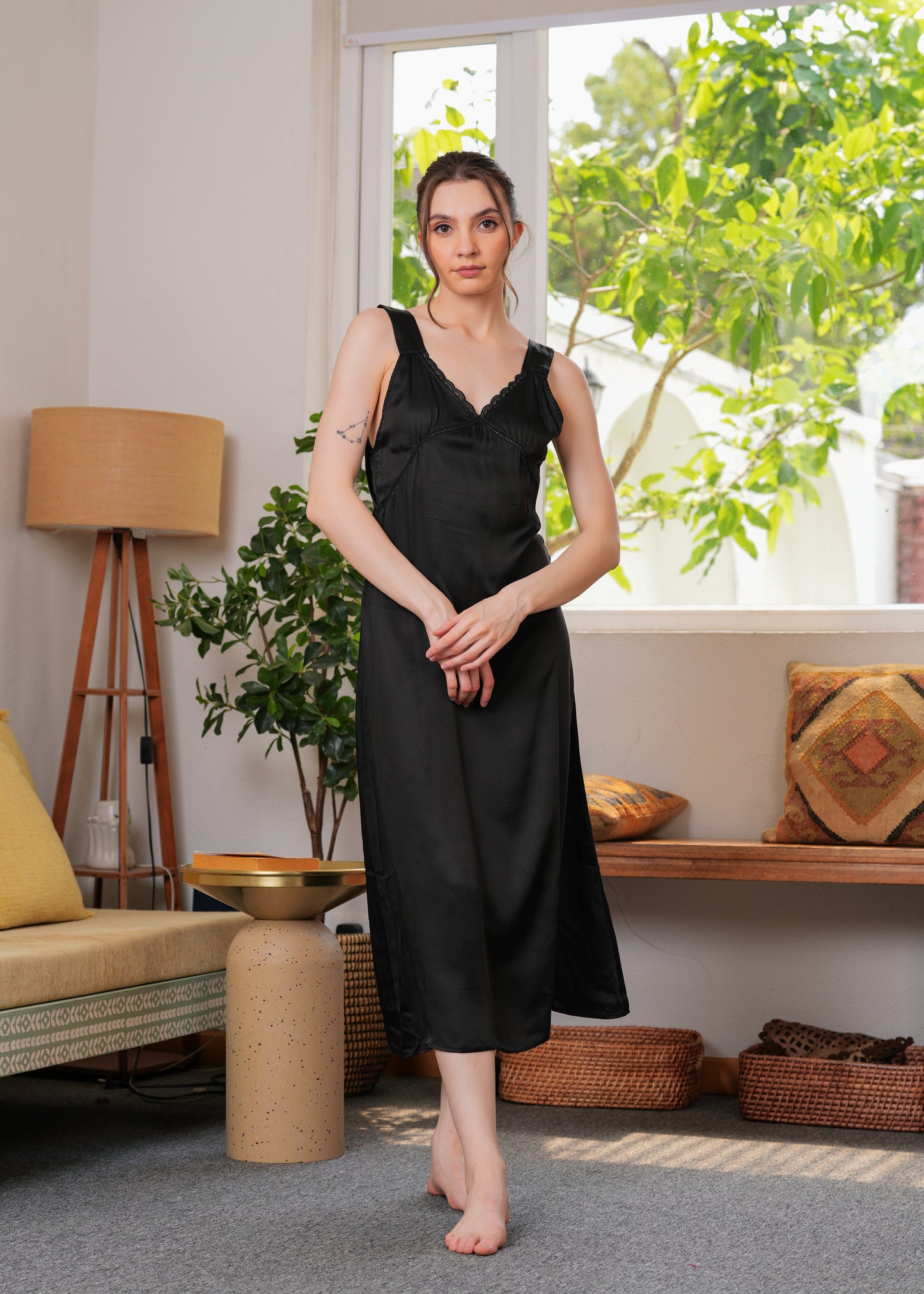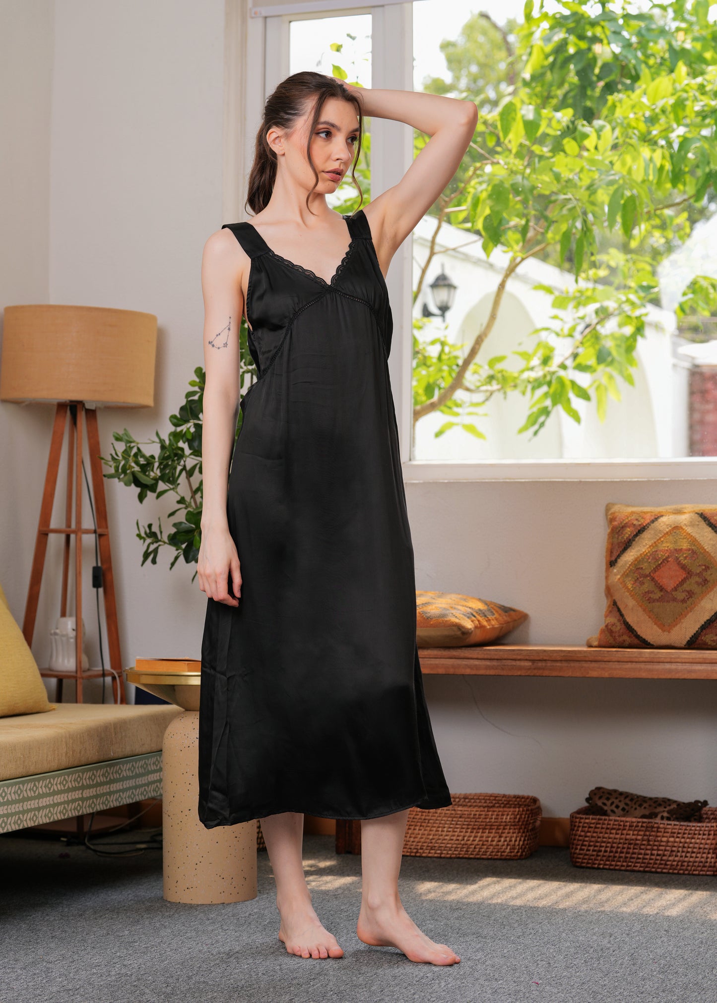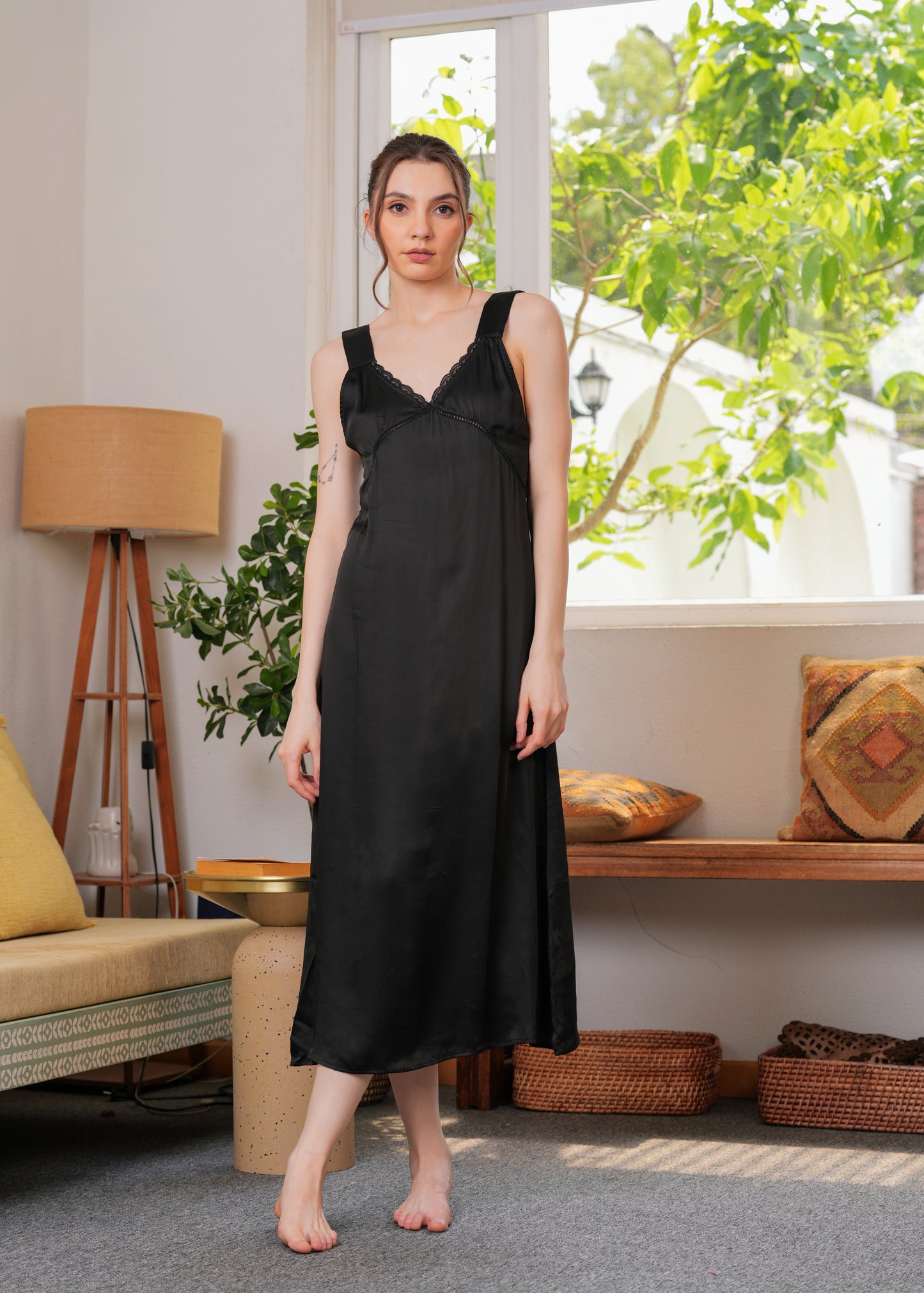 This dress is made from soft satin that looks like a dream—light, breathable, and perfect for all-day comfort. The delicate lace detailing at the neckline adds a feminine touch, while the relaxed silhouette flatters all body types with effortless grace.
