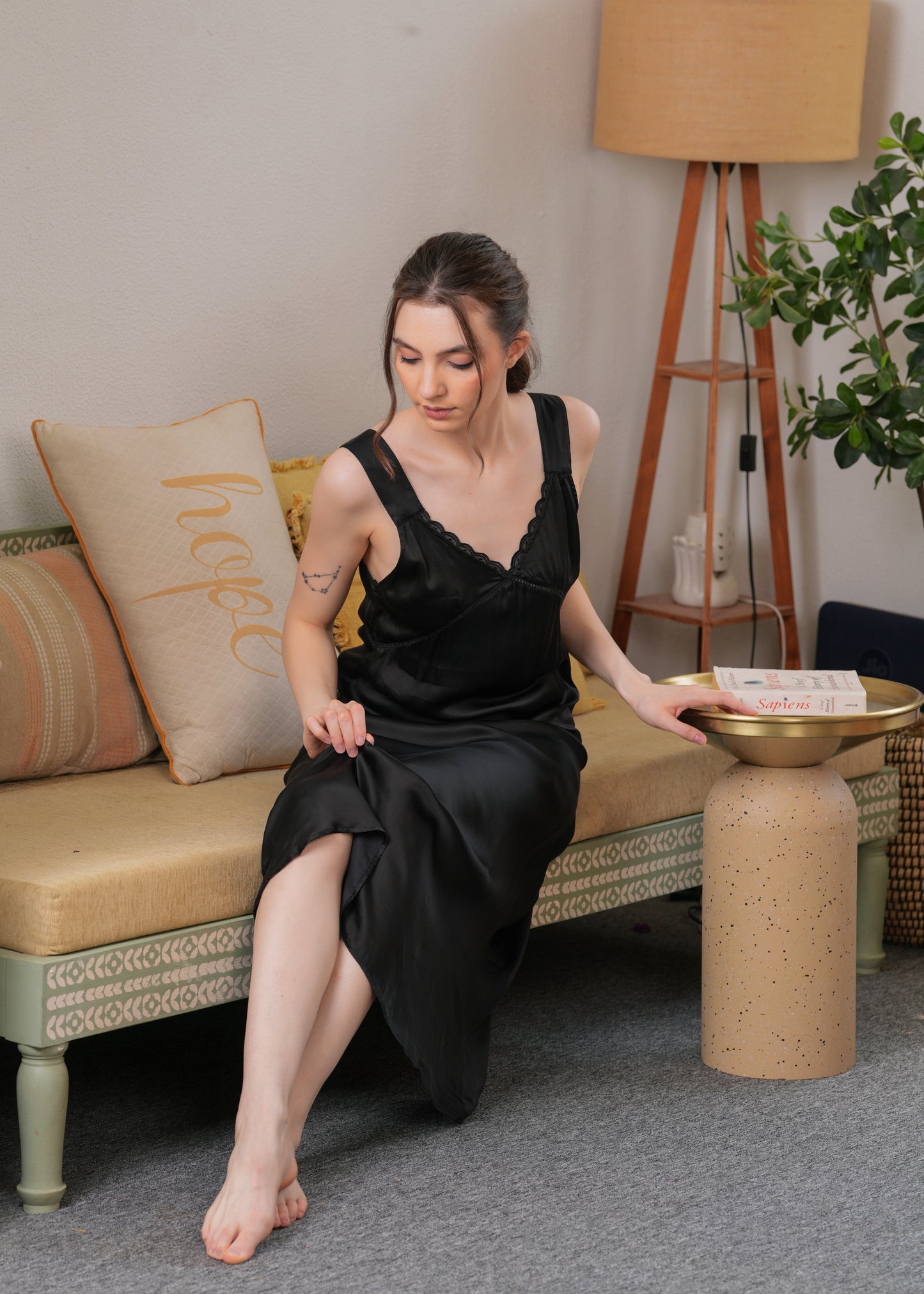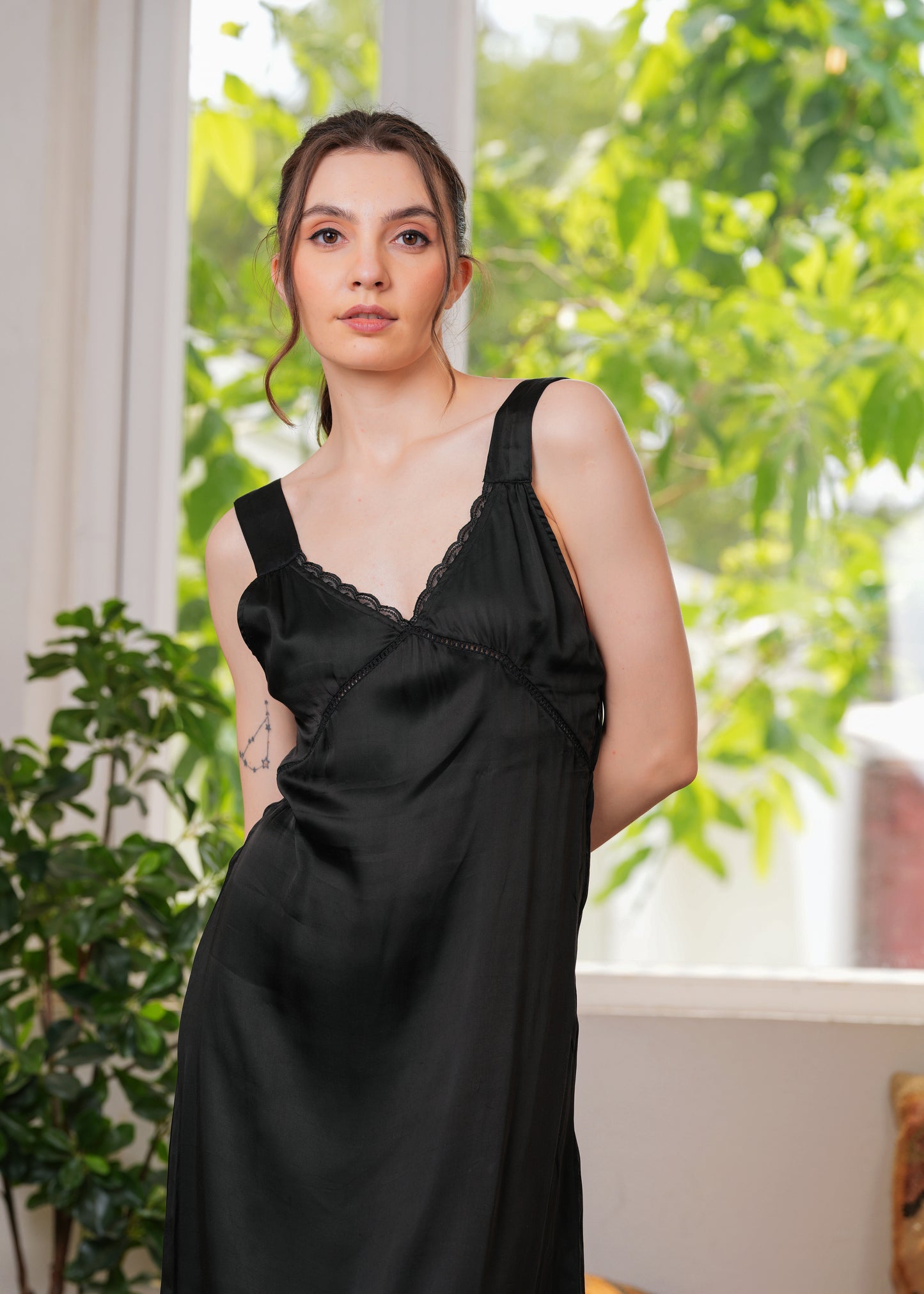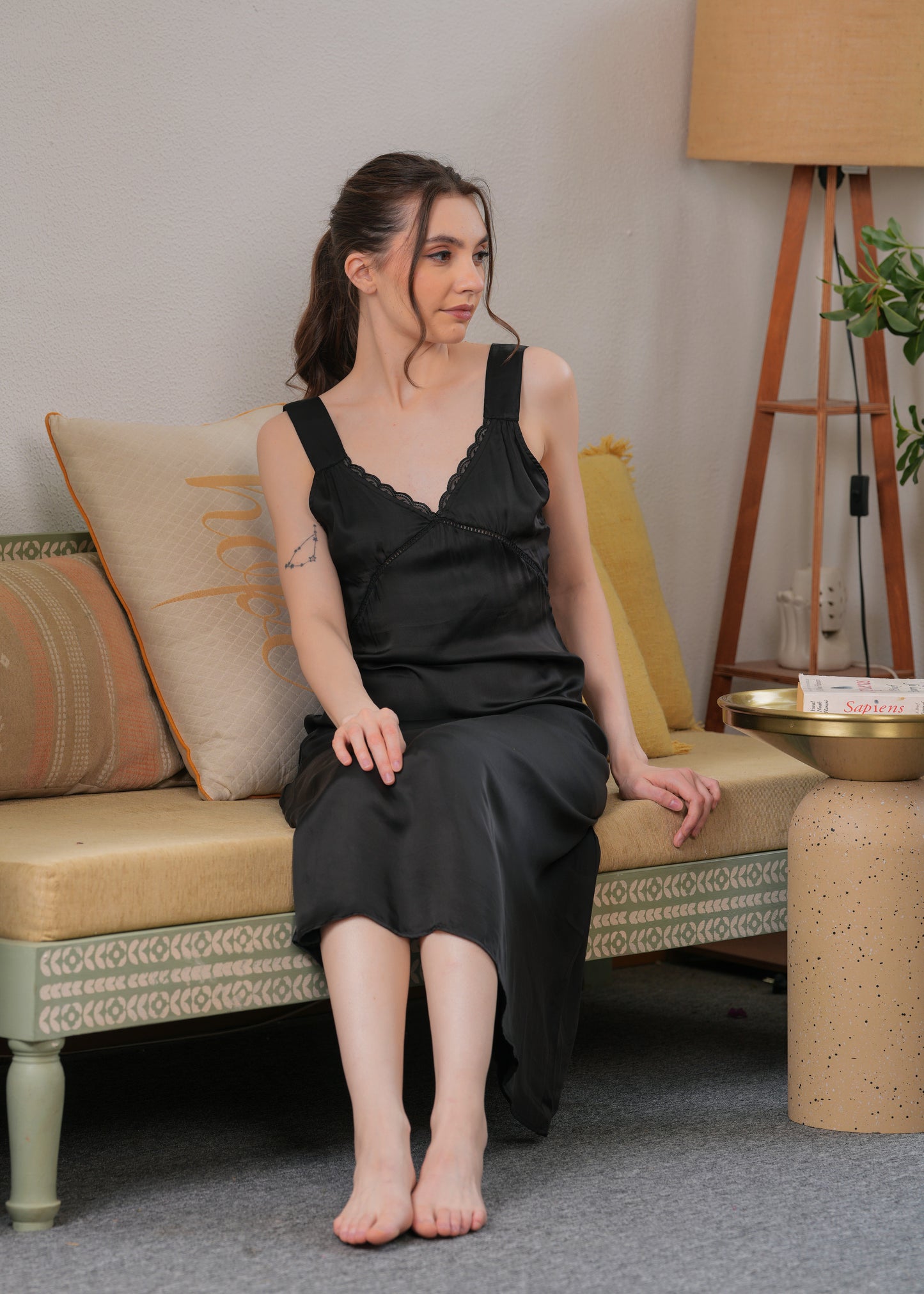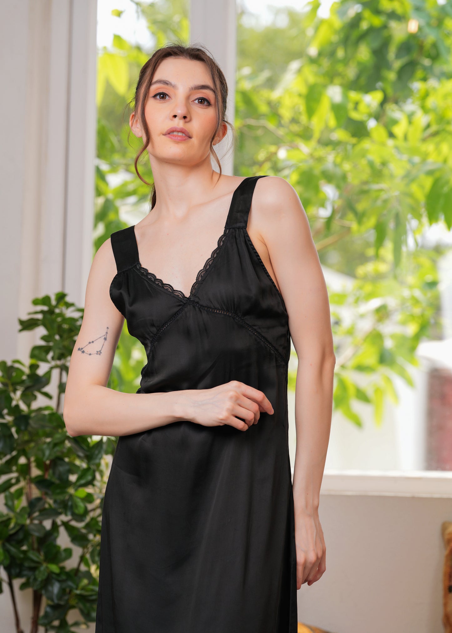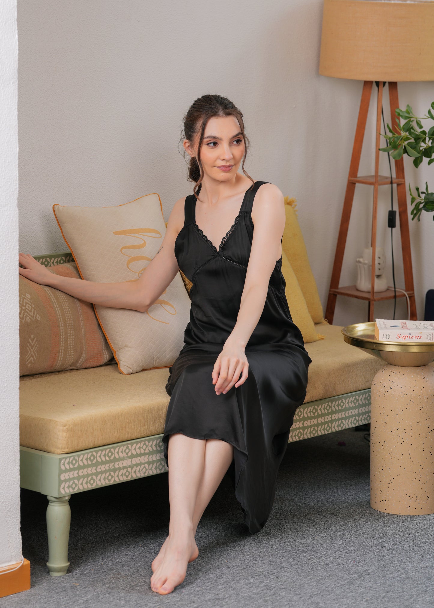 This dress is made from soft satin that looks like a dream—light, breathable, and perfect for all-day comfort. The delicate lace detailing at the neckline adds a feminine touch, while the relaxed silhouette flatters all body types with effortless grace.