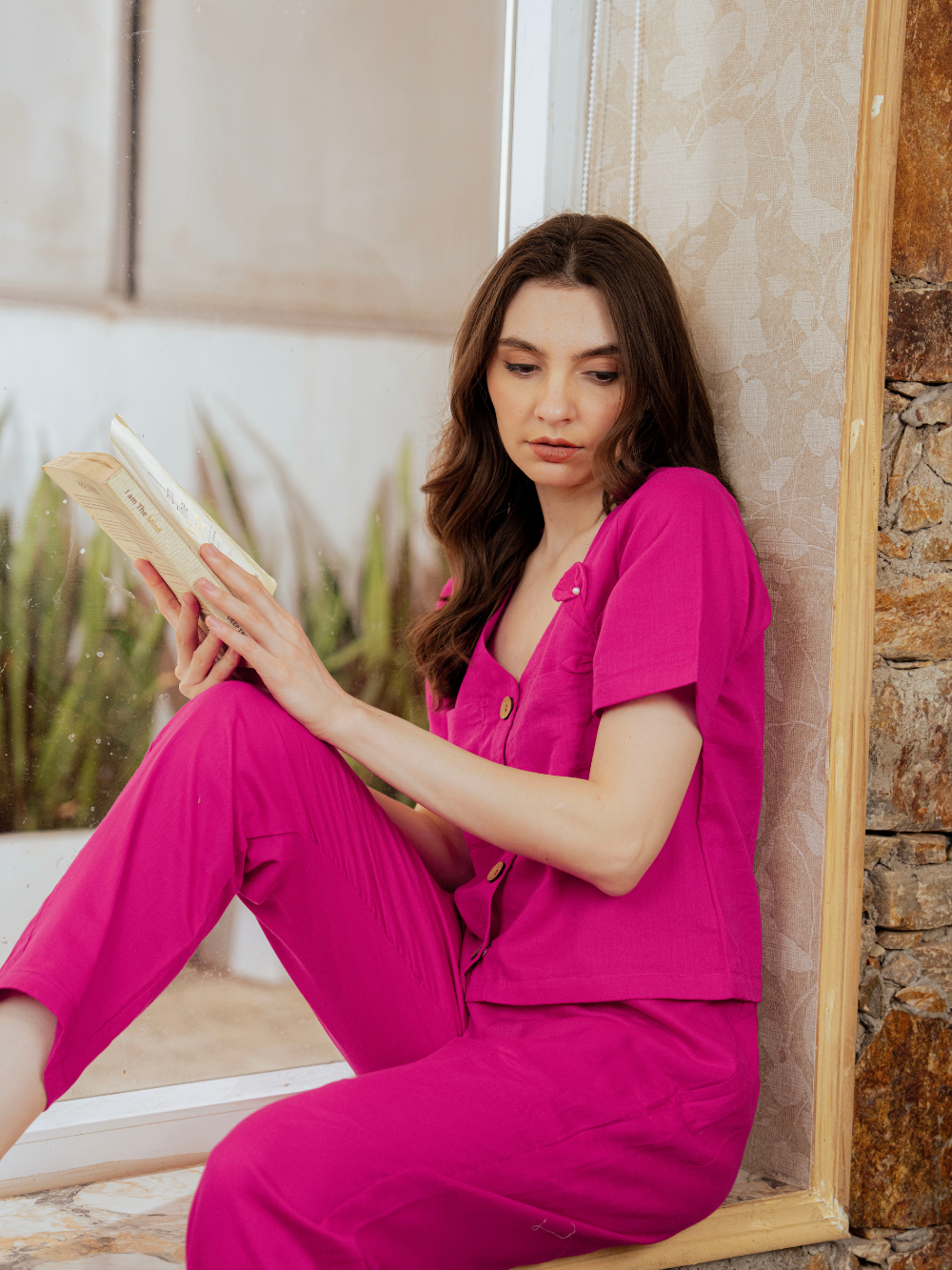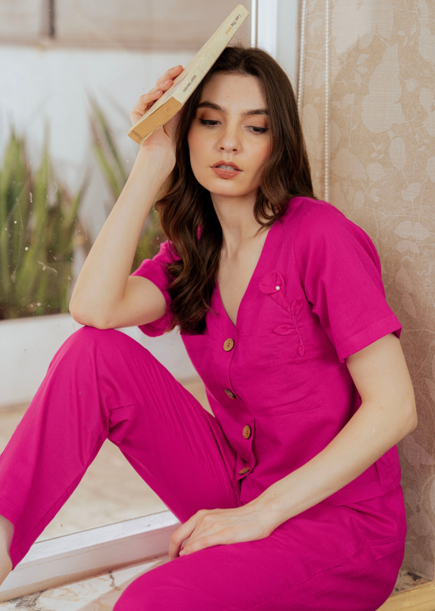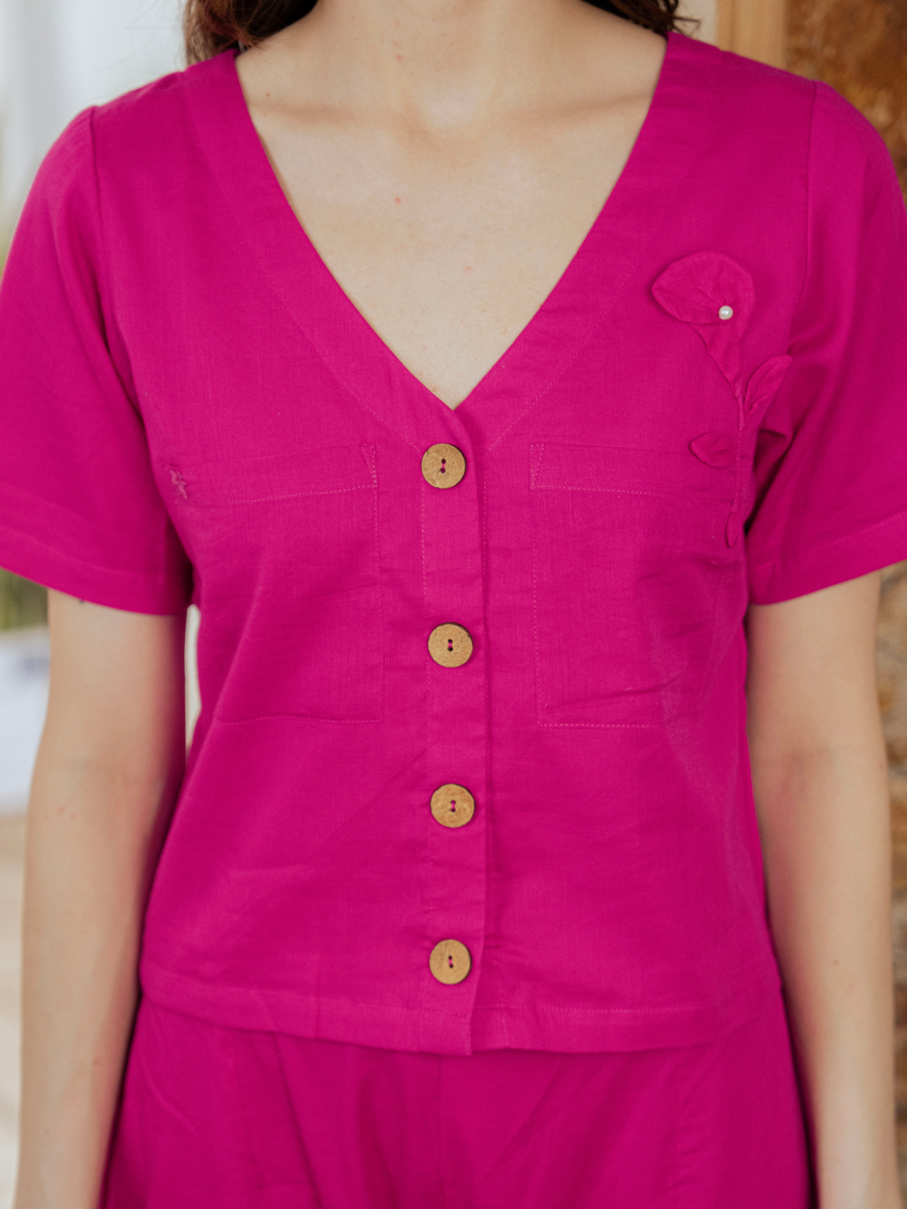 Made from breathable fabric, short-sleeved crop top features delicate front button detailing, delicate rose appliqué work on the front, adding a touch of artisanal charm, while the matching pants complete the look with grace.