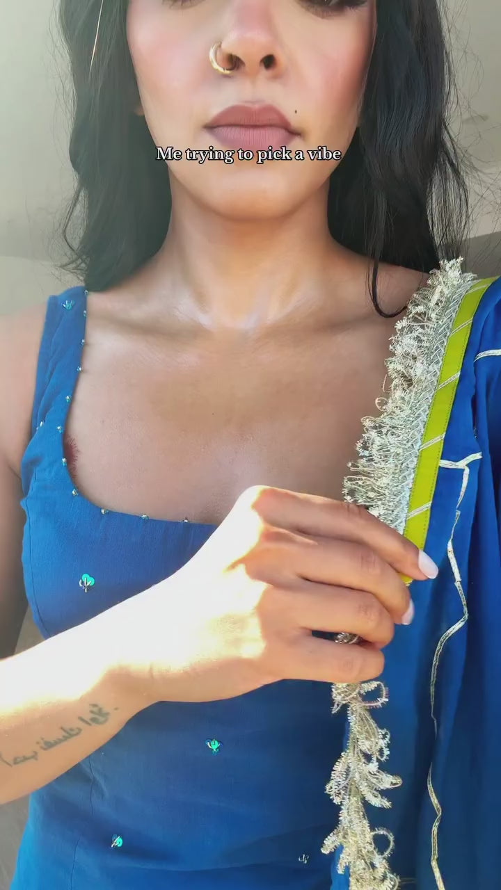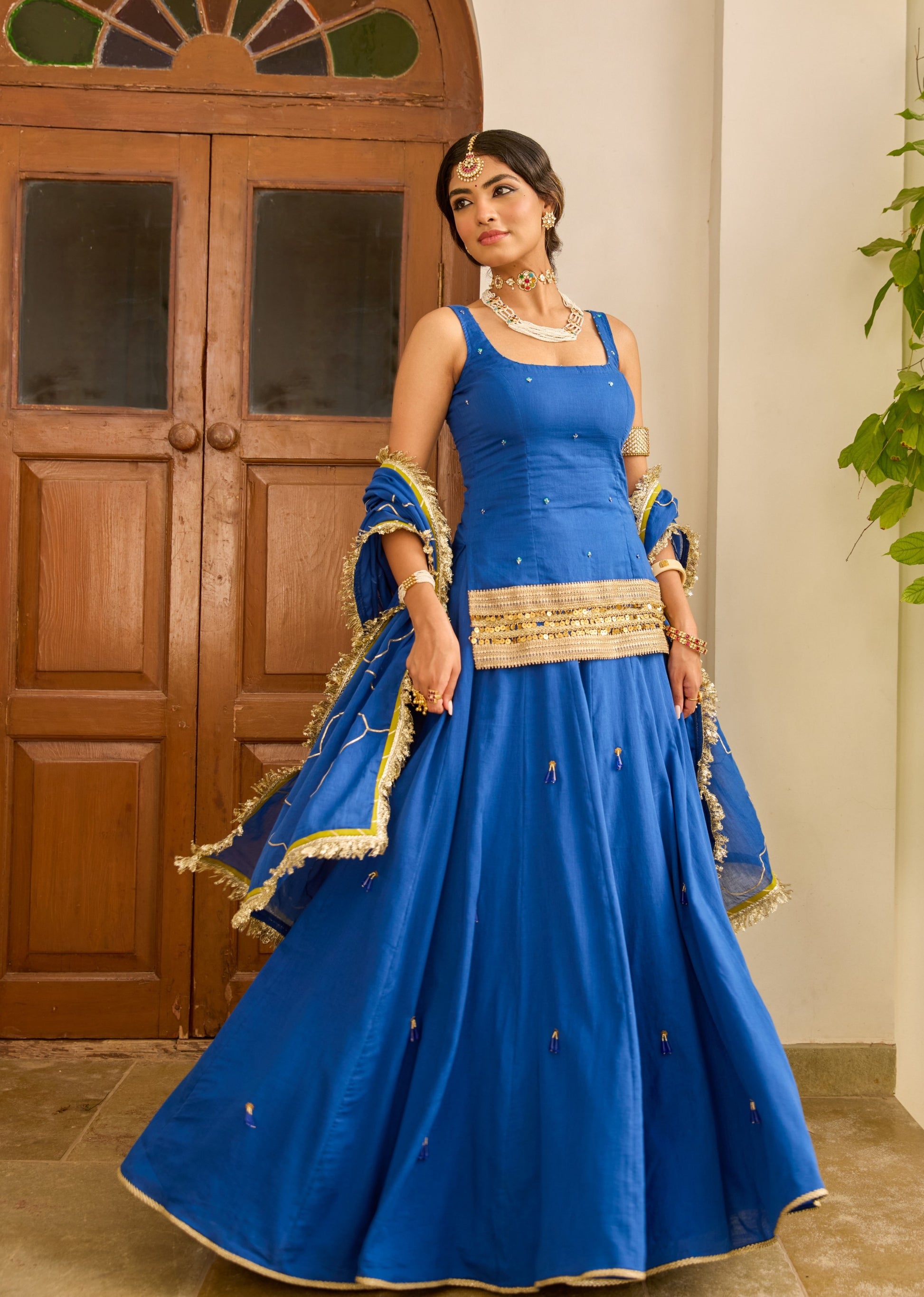 In neer blue colour and soft mulmul fabric, this skirt and top set brings full heroine energy- the kurta’s heavy tassels and coin-sequin shimmer speak in drama, while the skirt’s handmade hangings move like they’ve got their own storyline. Old soul, new sass.