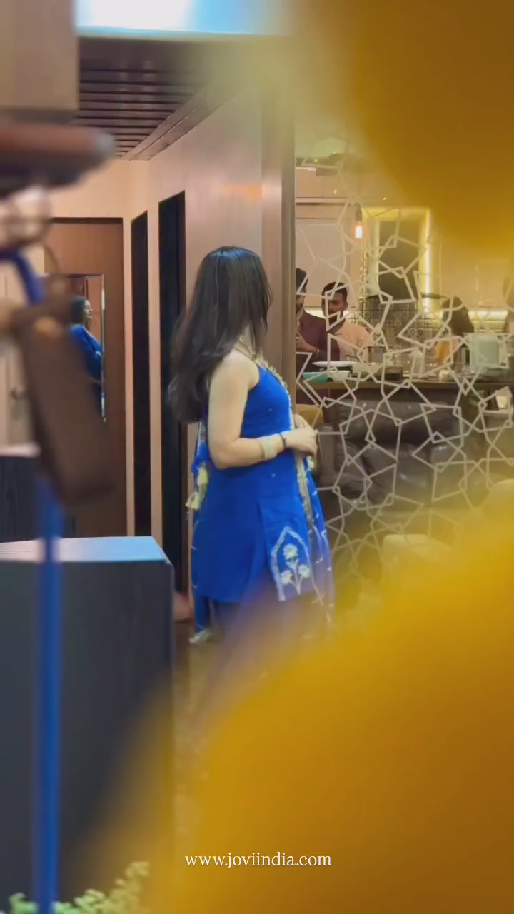 The fabric is soft mulmul, dyed in deep neer royal blue colour. It’s detailed with gotta jharokha that shines like Jaipur’s sun-kissed walls, while the farshi shalwar flows freely with bead and crystal hangings, inspired by the city’s lively bazaars.