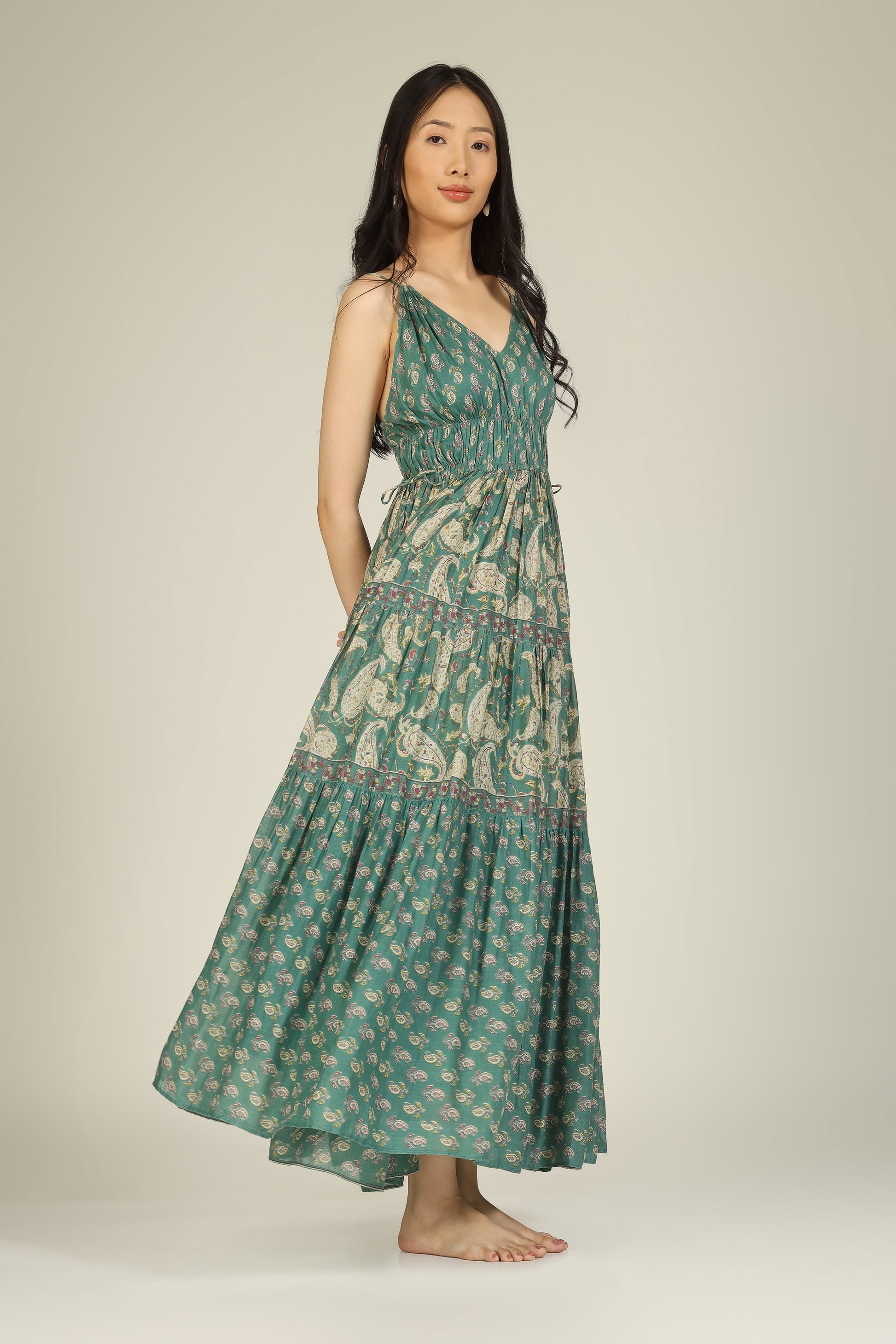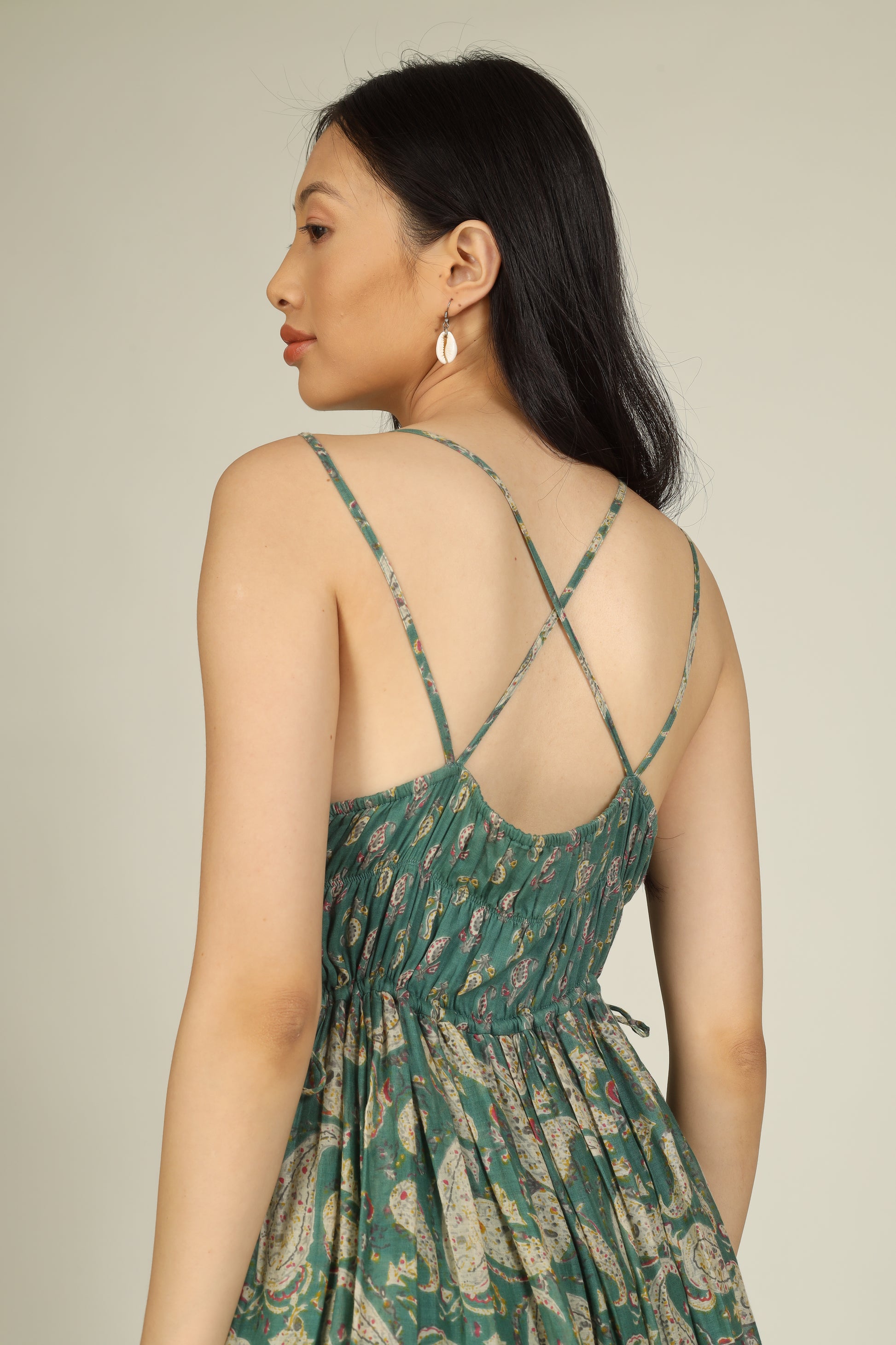 Green printed maxi dress from crafted in soft cotton mulmul, it features dual straps, a crisscross back, and a side knot dori tie with charming shell details. With elastic accents and delicate gathers, dress blends comfort and style.