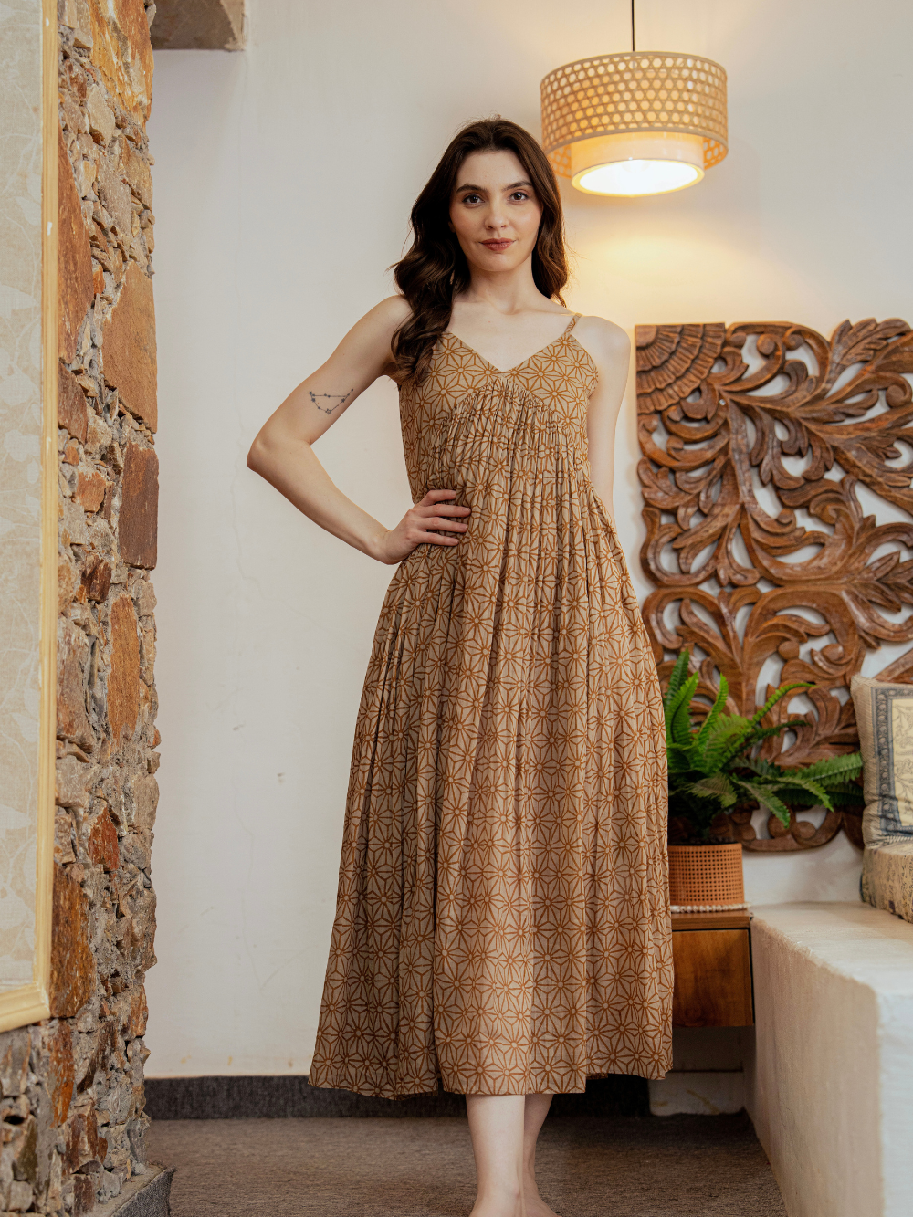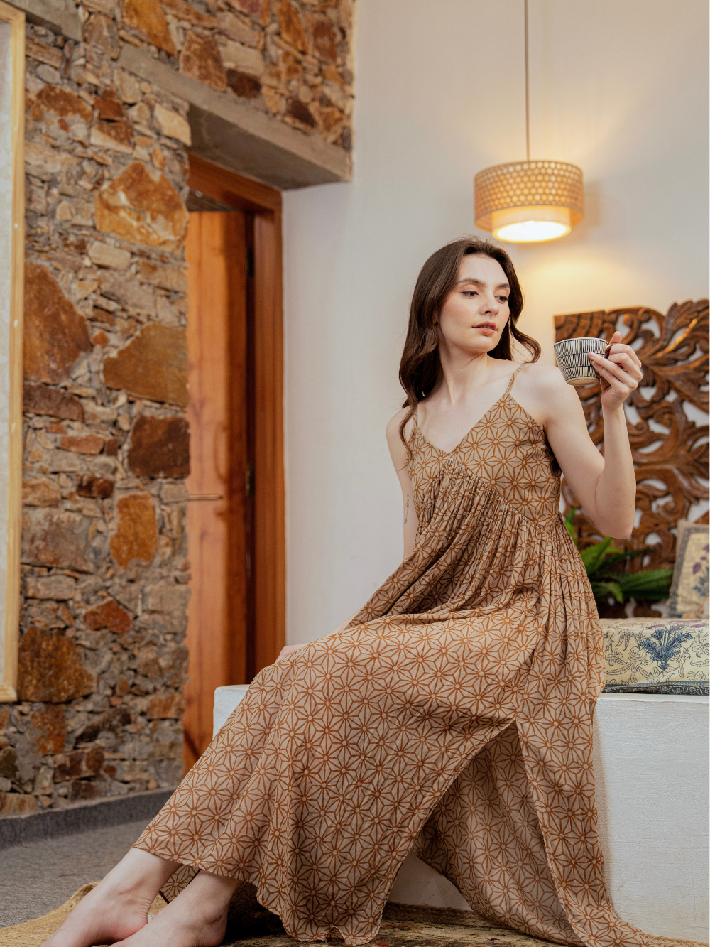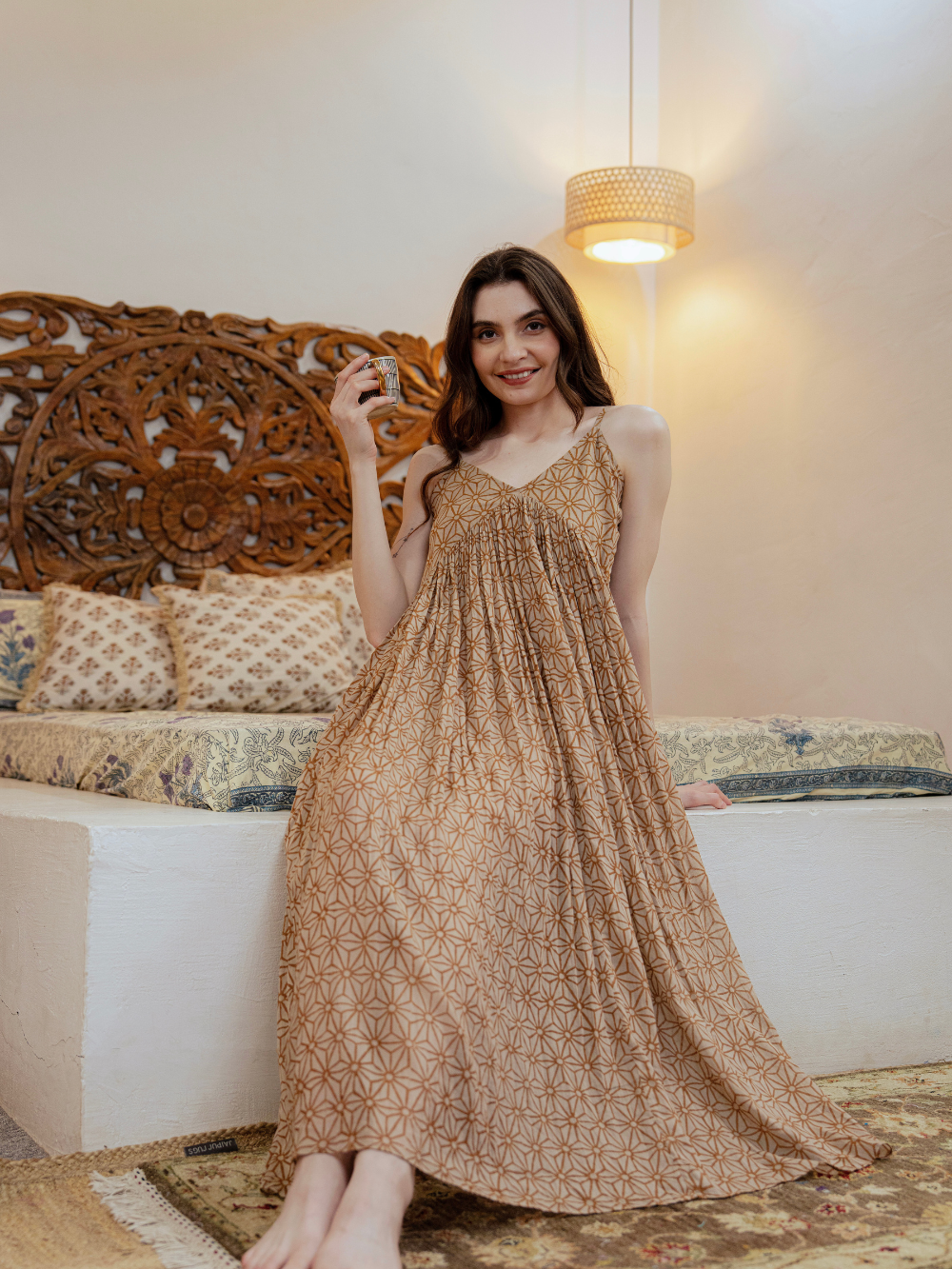 Experience effortless elegance with strappy printed maxi dress, a perfect blend of comfort and ethnic charm. Made from soft, breathable fabric, this dress feature strappy neckline and relaxed fit offer an airy, flattering silhouette,