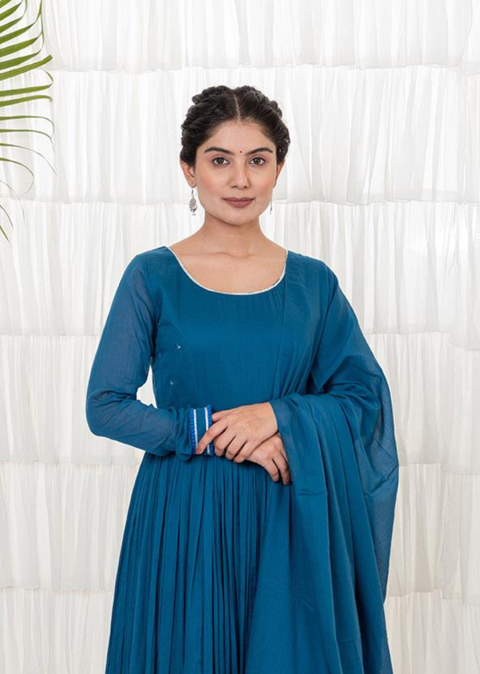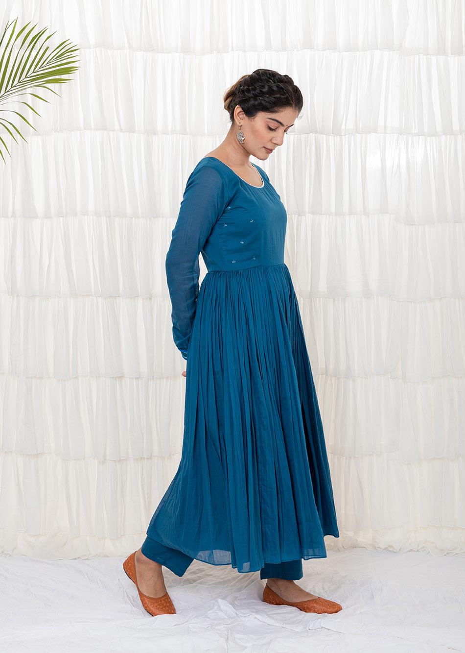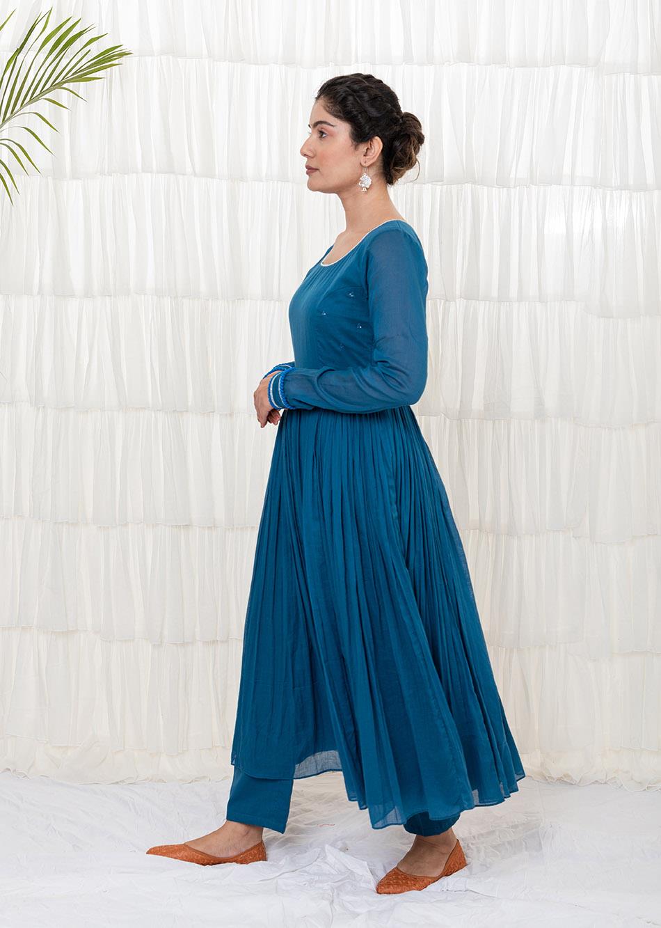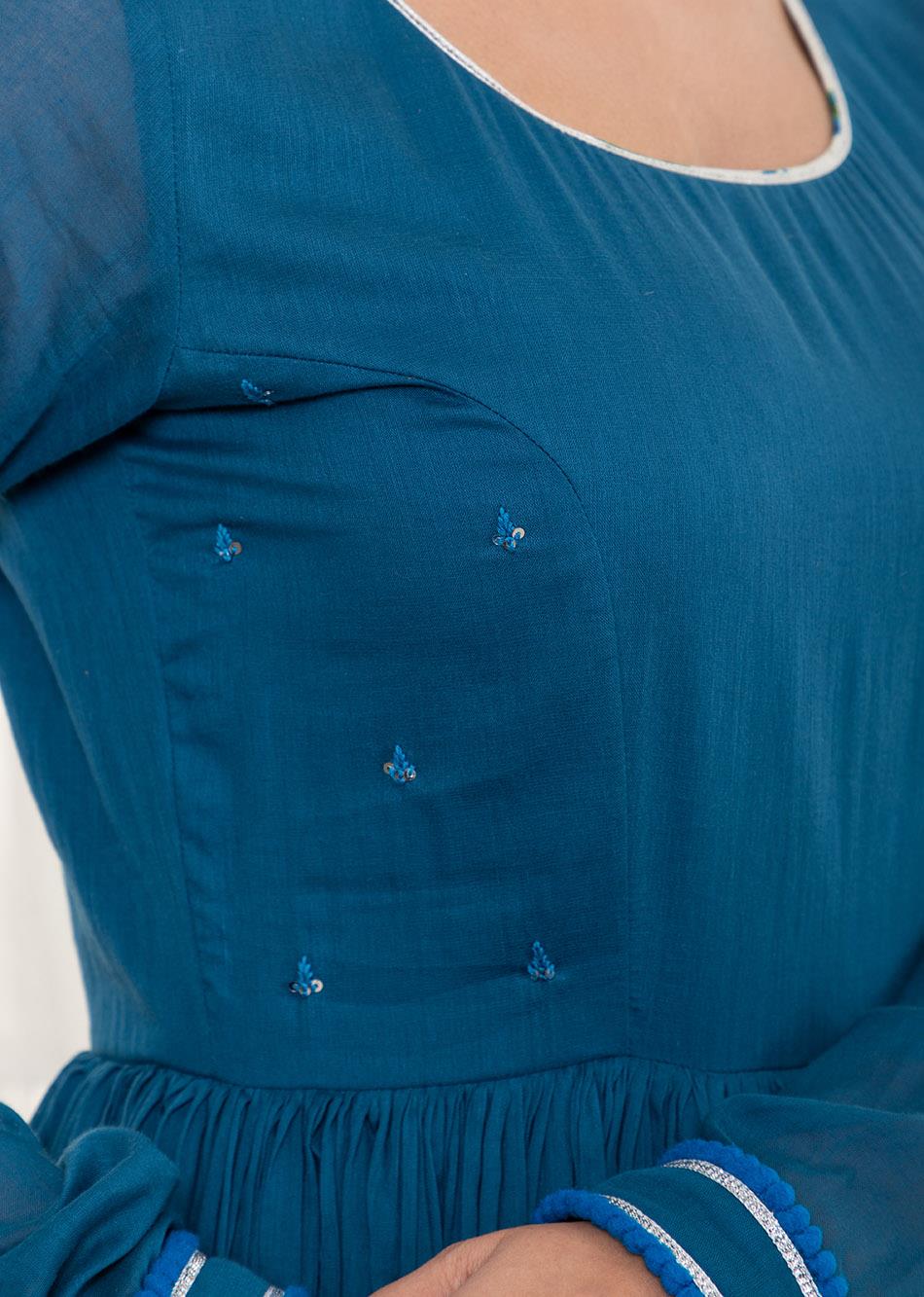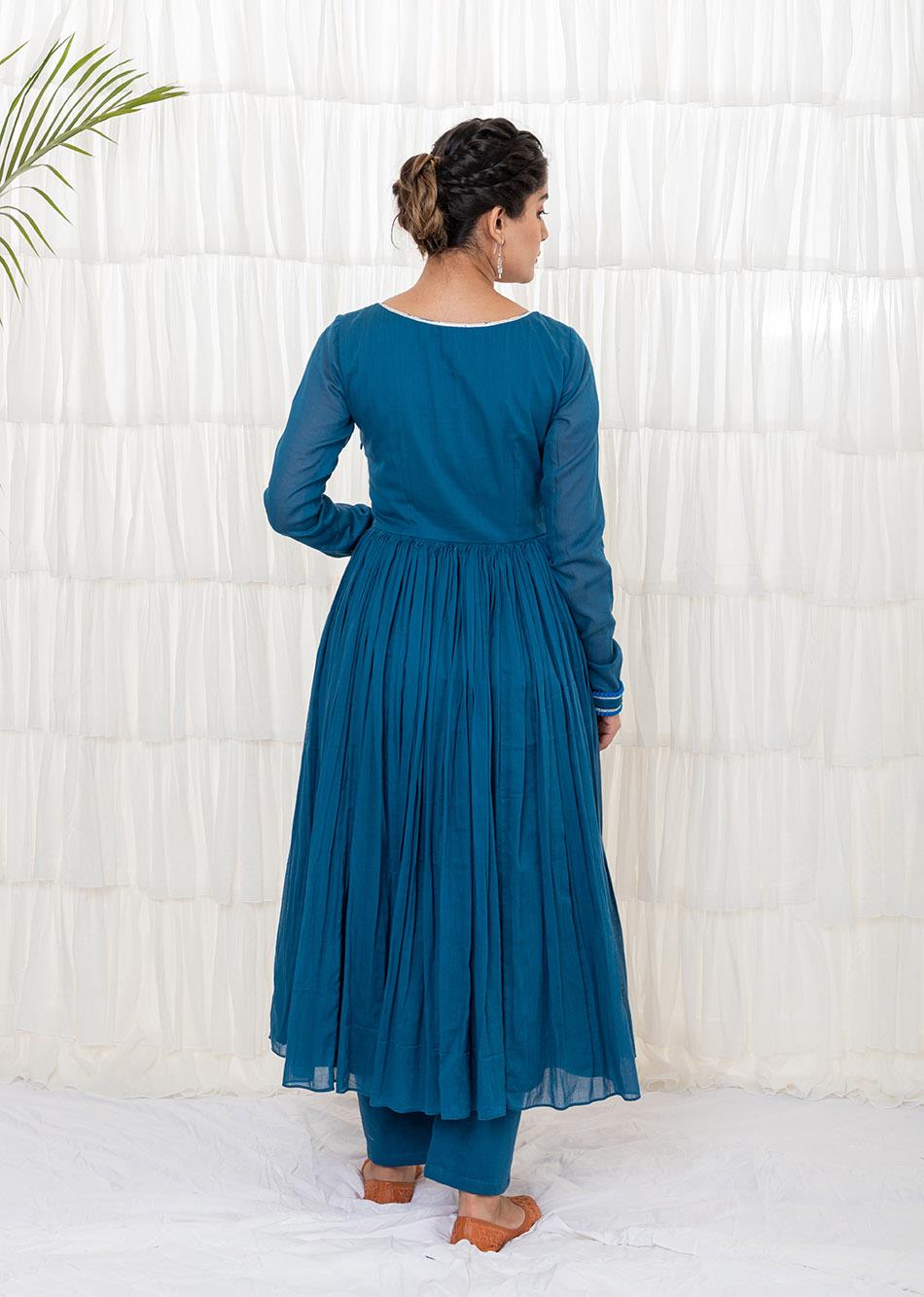 The teal blue anarkali is embellished with fine hand embroidery that has exquisite gathers and gotta details. It is accessorized with a dupatta featuring flowery tassels at the corners, and straight pants and lace sleeves.