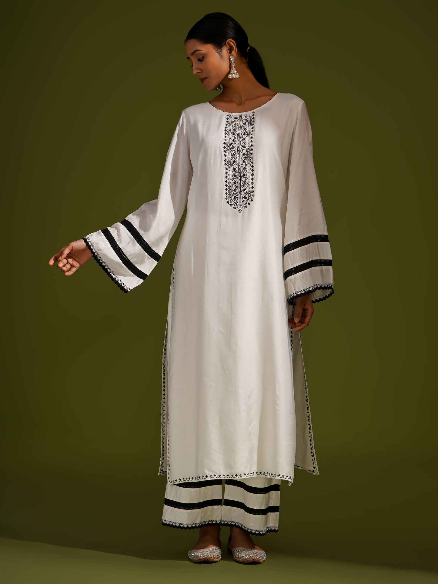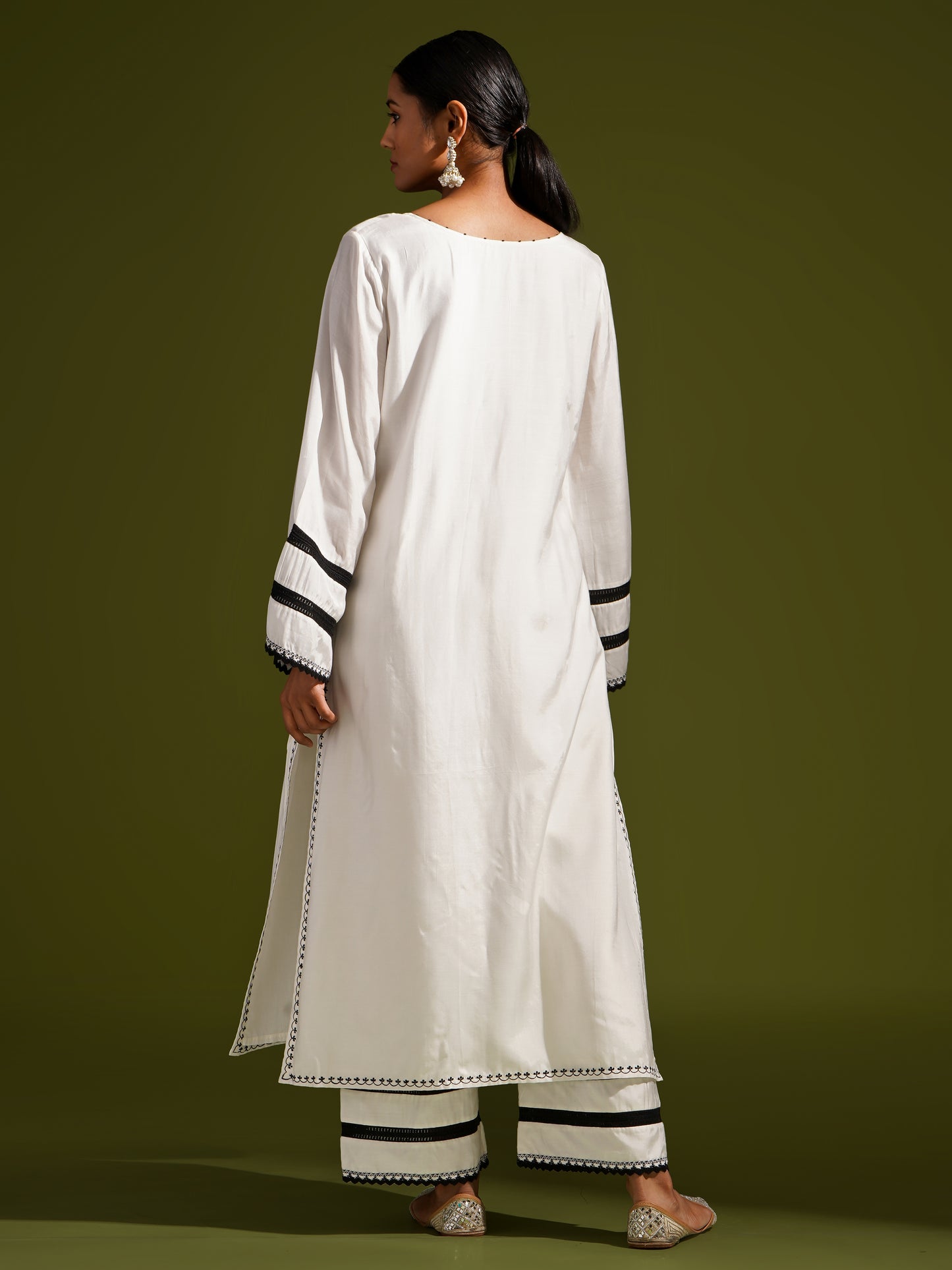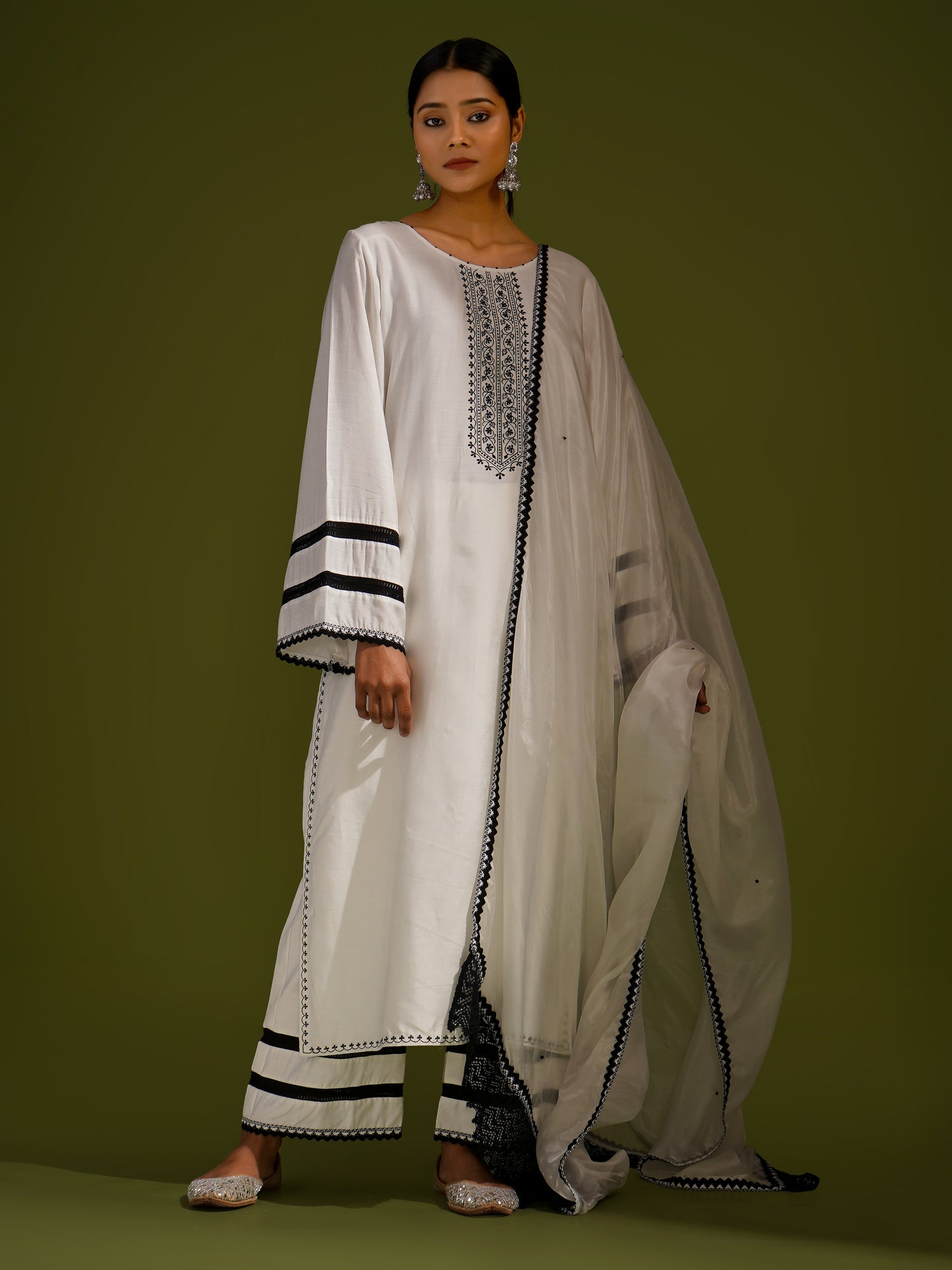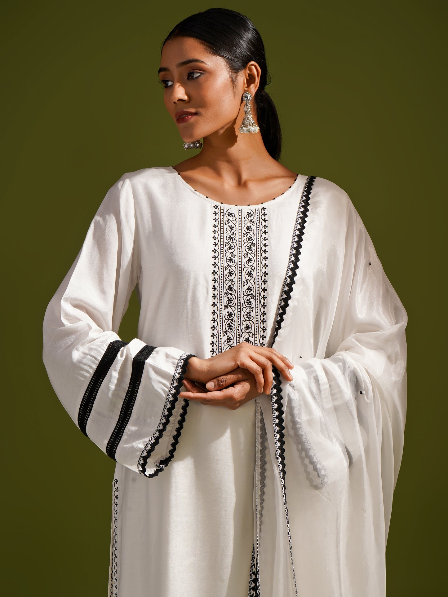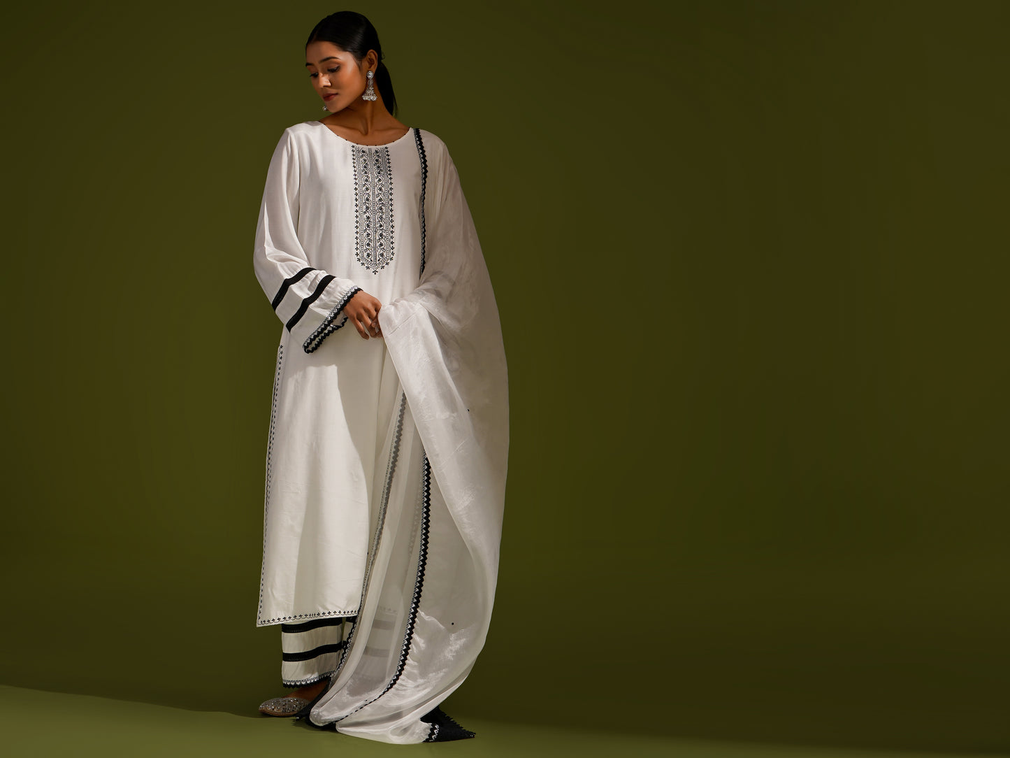 This white kurta pant set includes a straight kurta with layered lace sleeves, moti detailing on the neckline, and thread embroidery embellishments. It is finished with a silk dupatta featuring lace corners and moti chidkav, and is worn with loose pants with lace details.